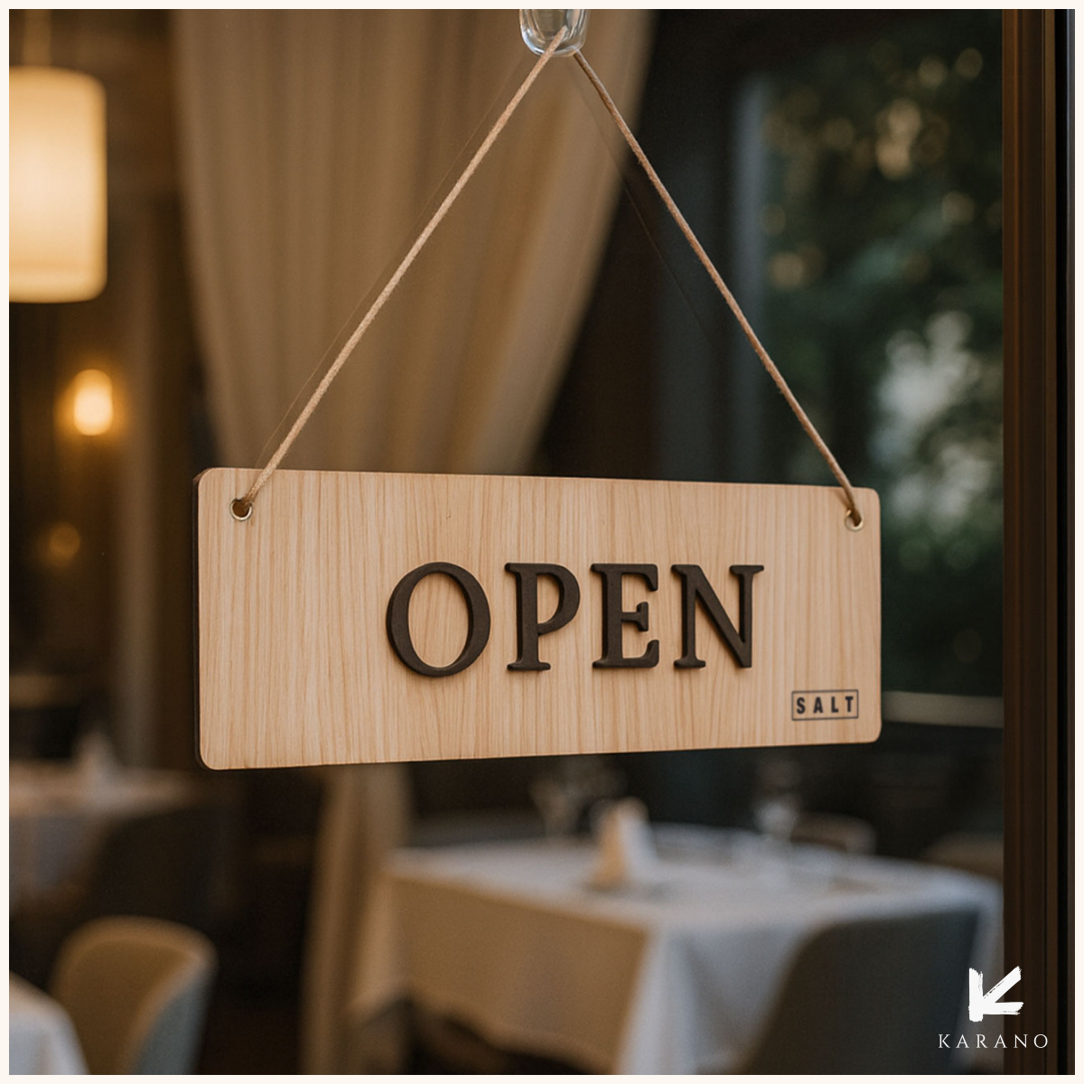 3D butik dørskilt i træ med udskåret tekst – “Open” på den ene side og “Closed” på den anden. Et stilrent og praktisk skilt til butik, café, restaurant, gift shop eller reception.