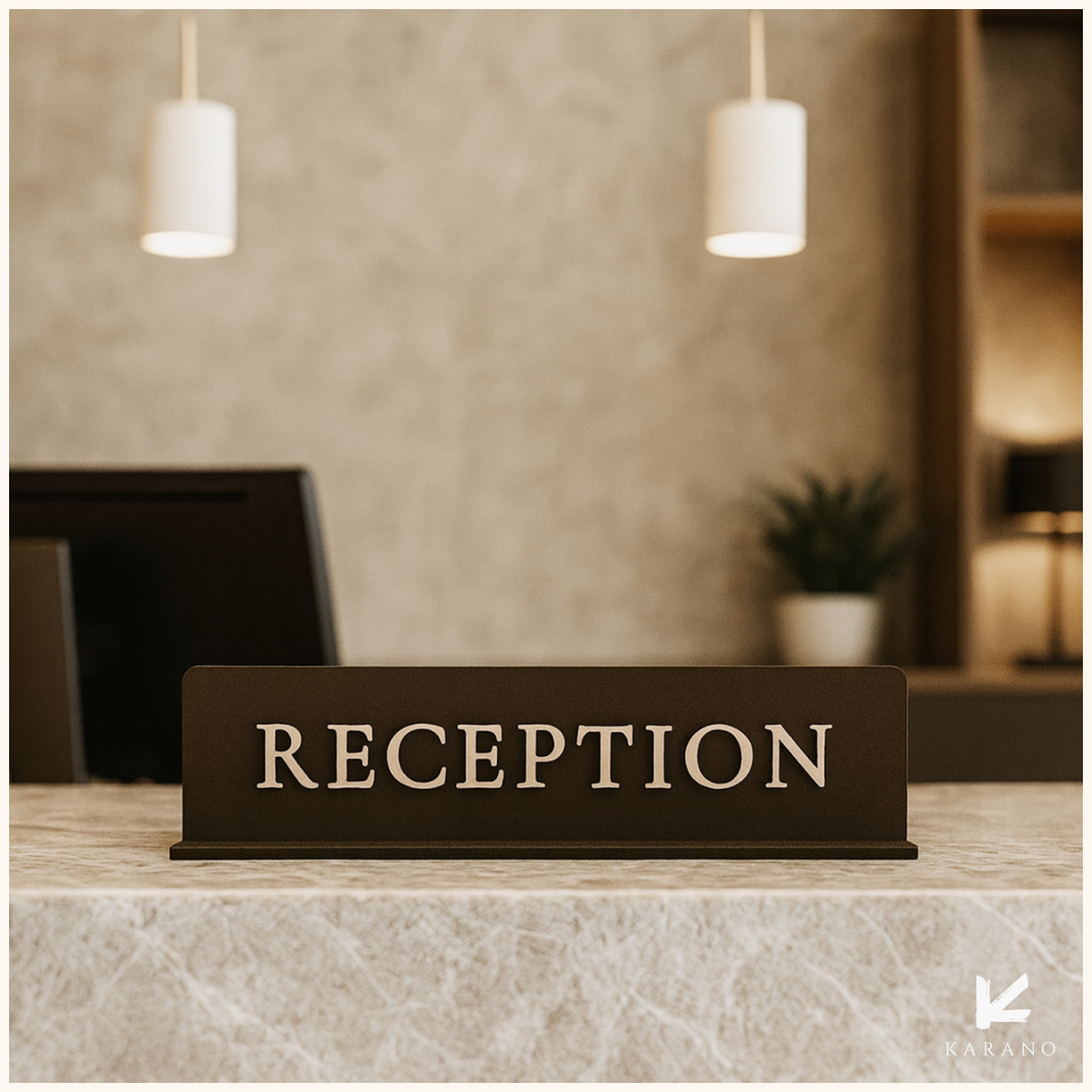 Et elegant og moderne receptionsskilt i 3D-design, leveret med stabil holder. Perfekt til hoteller, virksomheder og receptioner, hvor et tydeligt og stilfuldt førstehåndsindtryk er vigtigt.