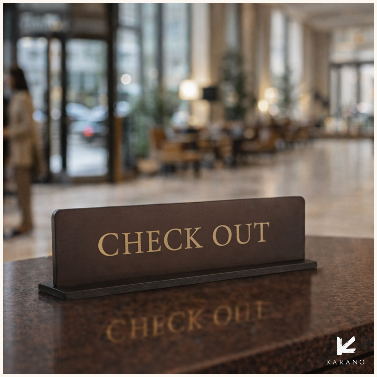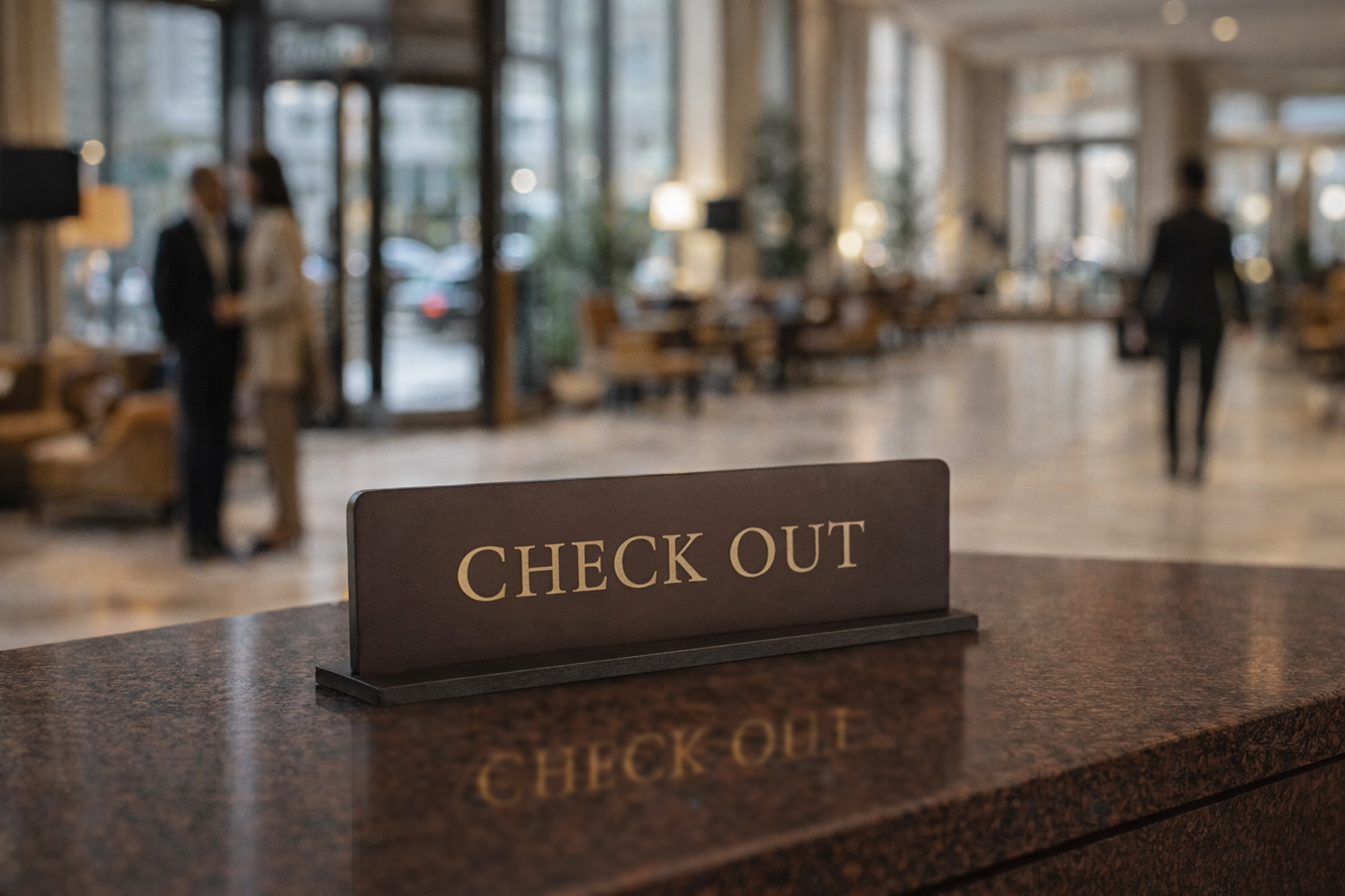 Elegant Check Out-receptionsskilt i læder til hotel. Fremstillet i læder af høj kvalitet med stabil bagplade og et eksklusivt udtryk, der guider gæsterne diskret ved check-out.