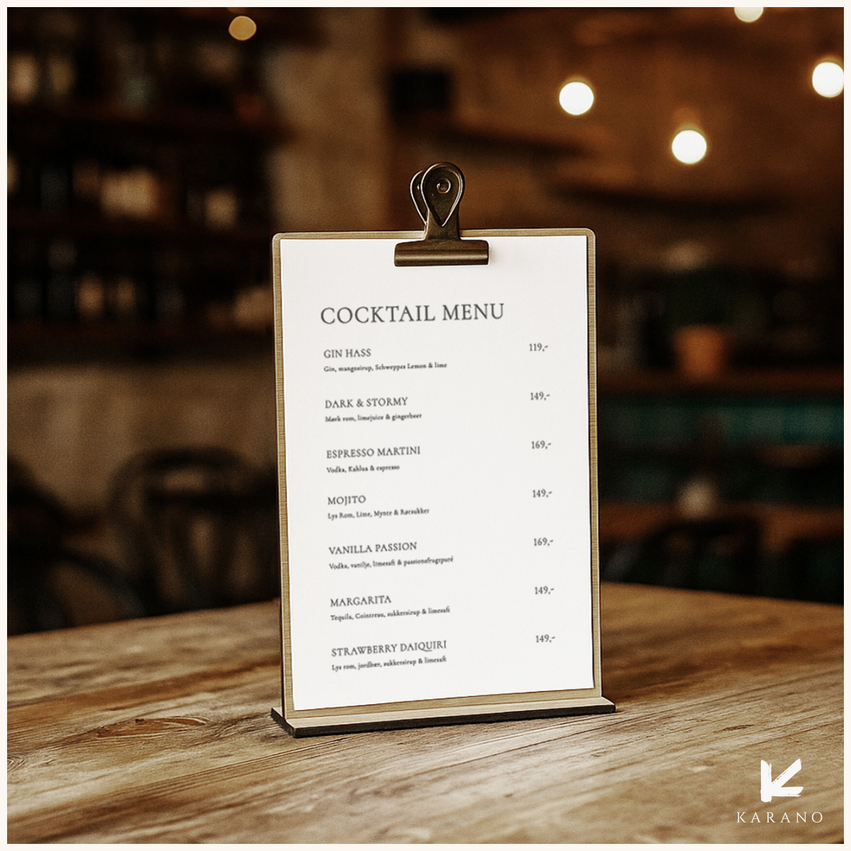 Håndlavede cocktail-holdere med fødder i træ og metalklemme i toppen. Ideel til restauranter og caféer. Menuen udskiftes nemt ved at løsne klemmen, og det stilrene design kombinerer funktionalitet med et eksklusivt udtryk. Logogravering kan tilføjes.