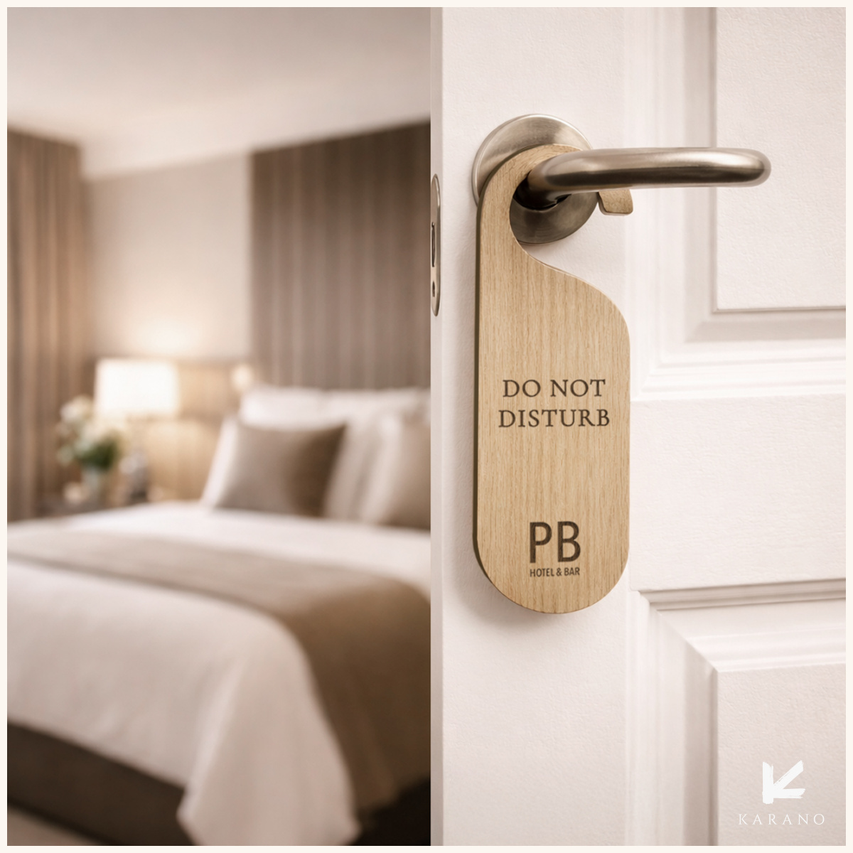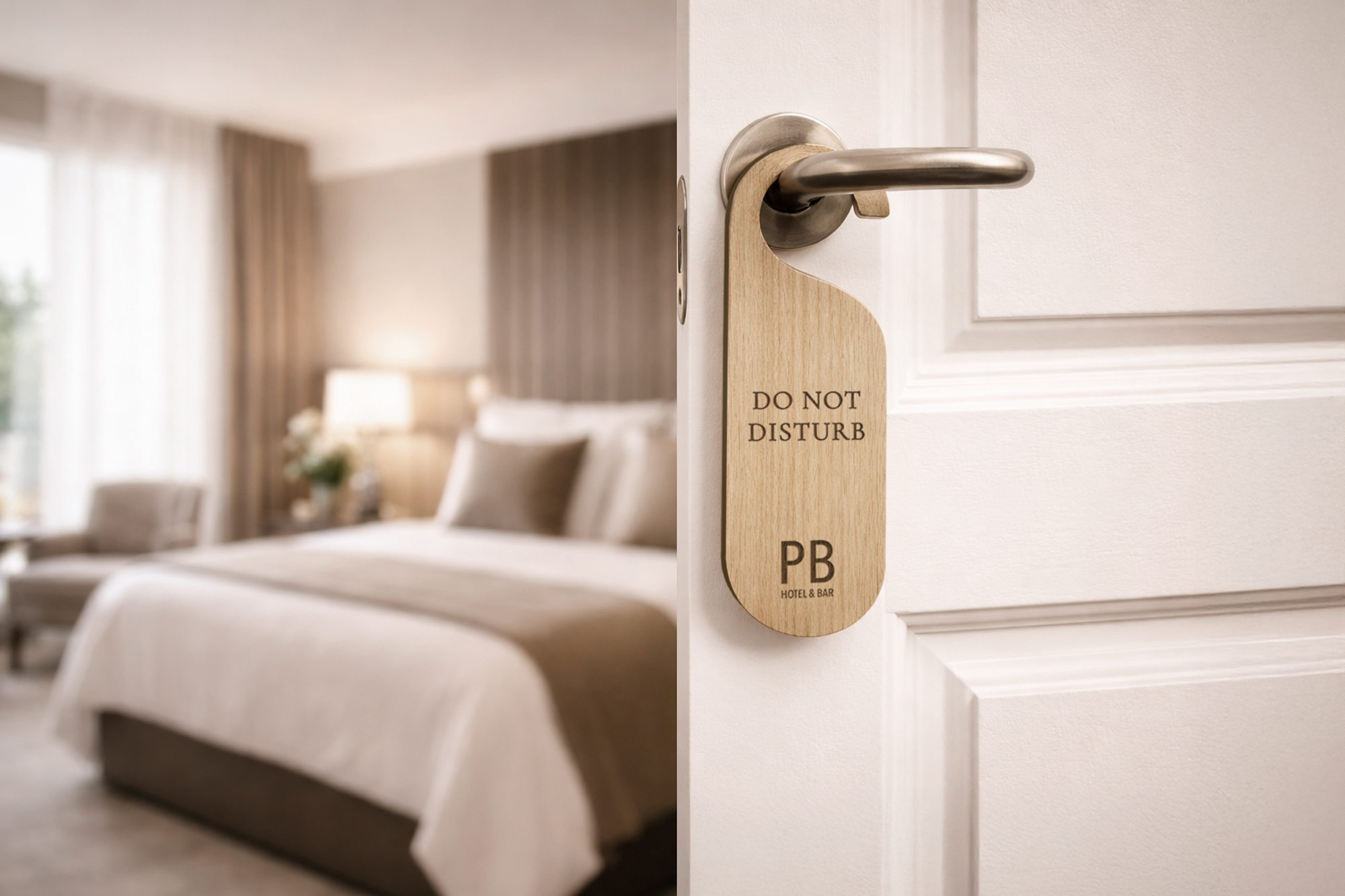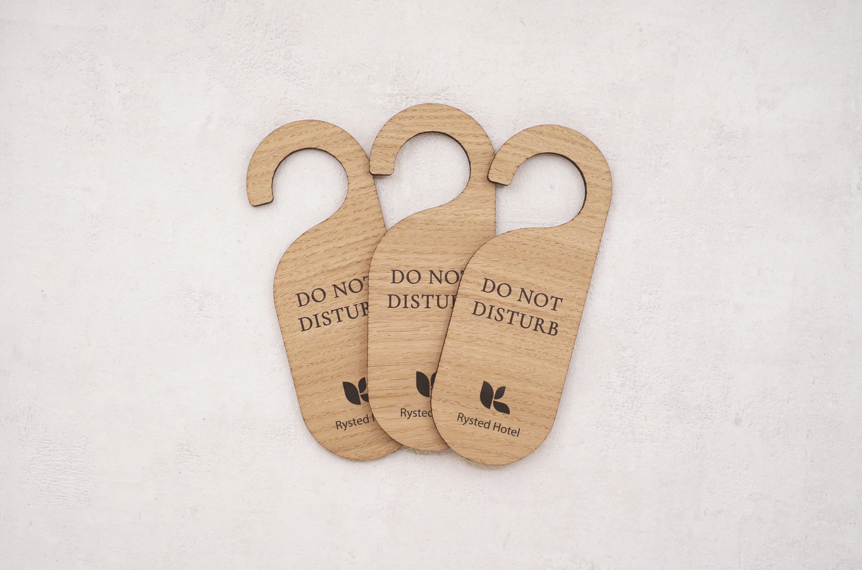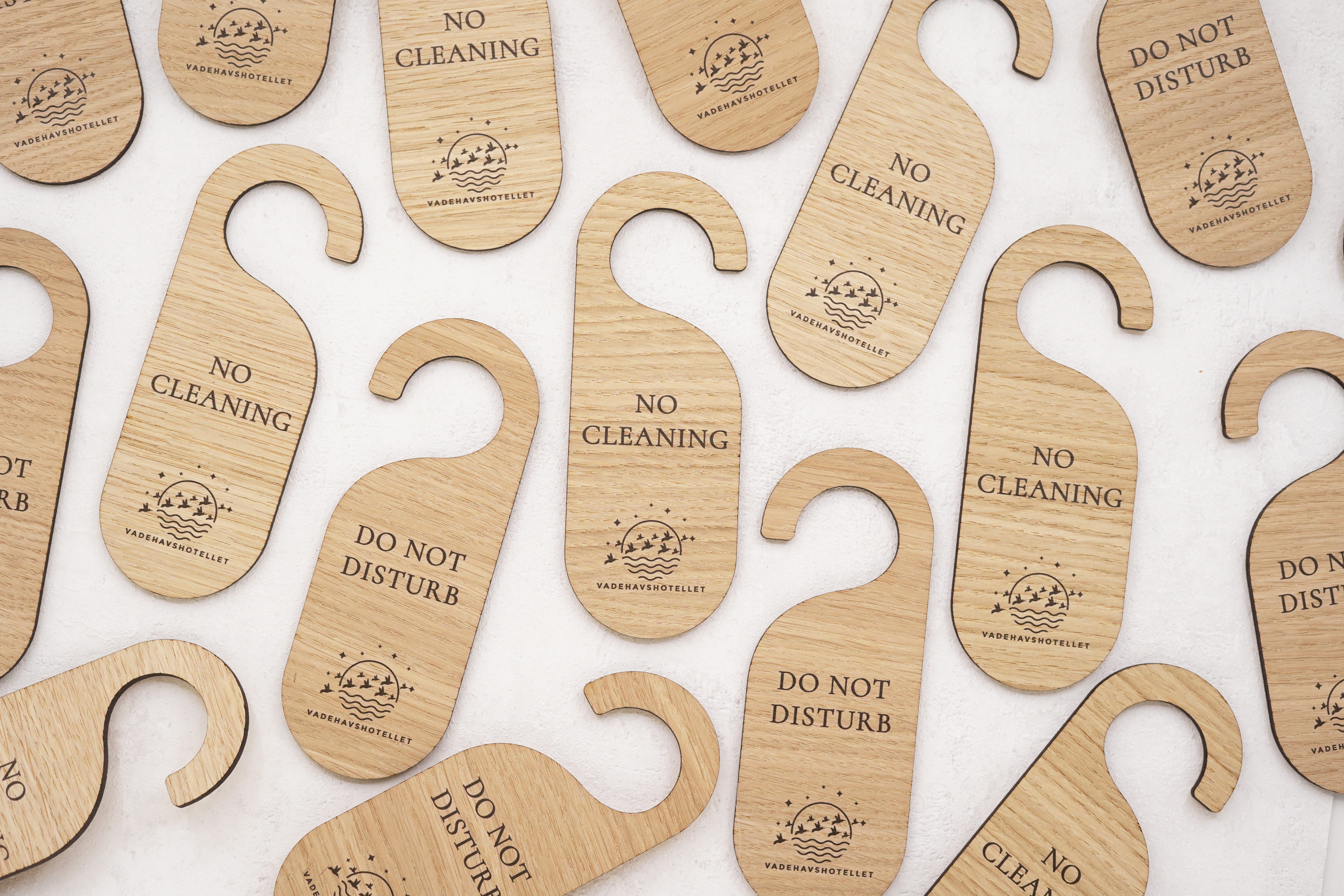 Dørhængere i træ med valgfri tekst og mulighed for logo, hvis det ønskes. Denne elegante og holdbare dørhænger tilføjer et professionelt præg til f.eks. hotelværelser, mødelokaler eller til kontoret.