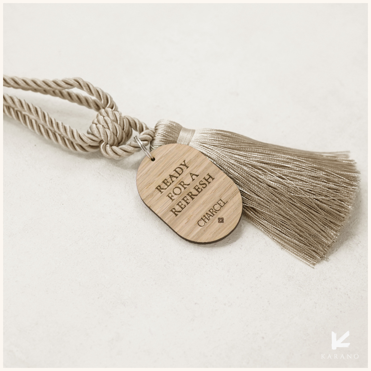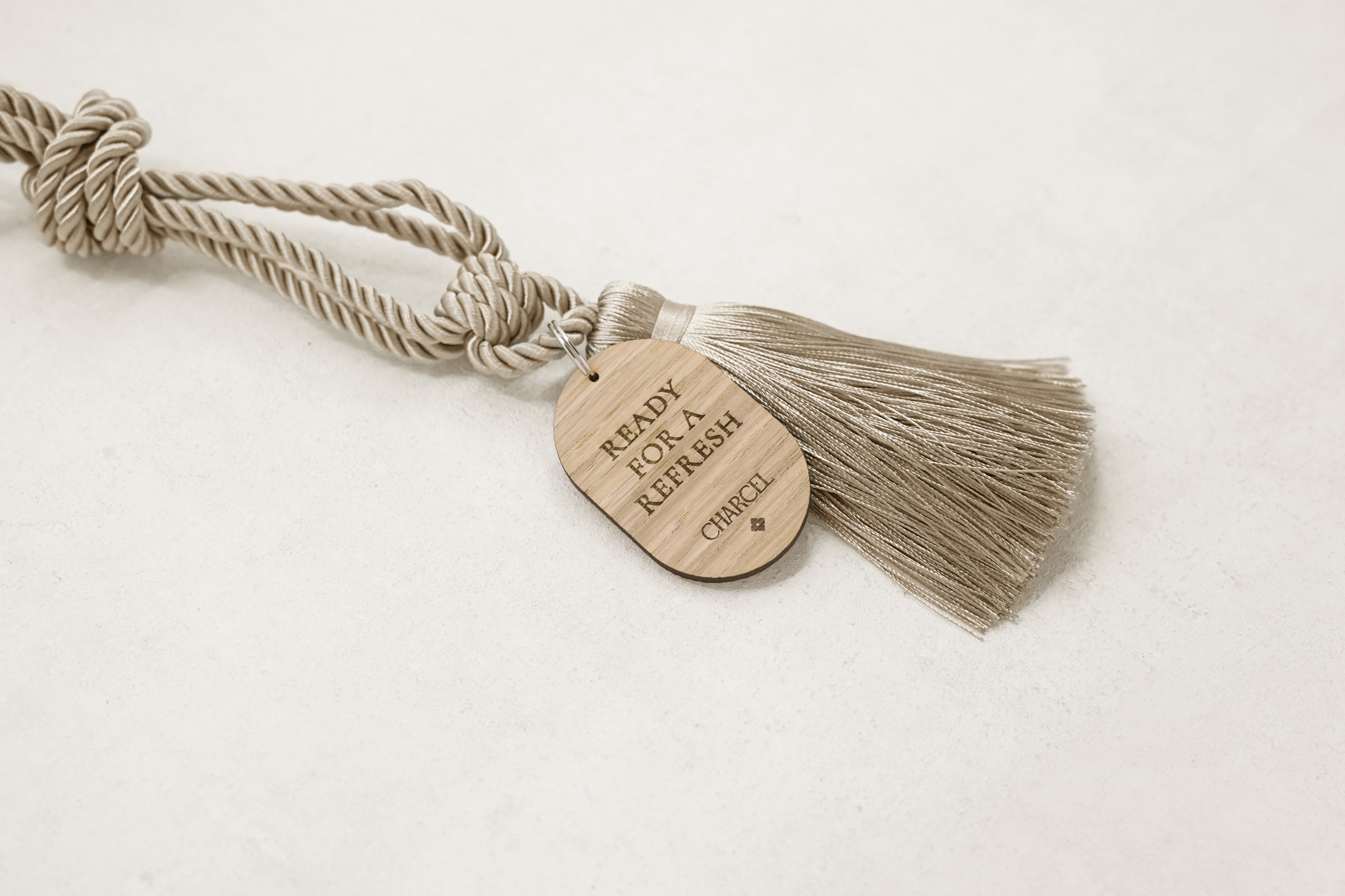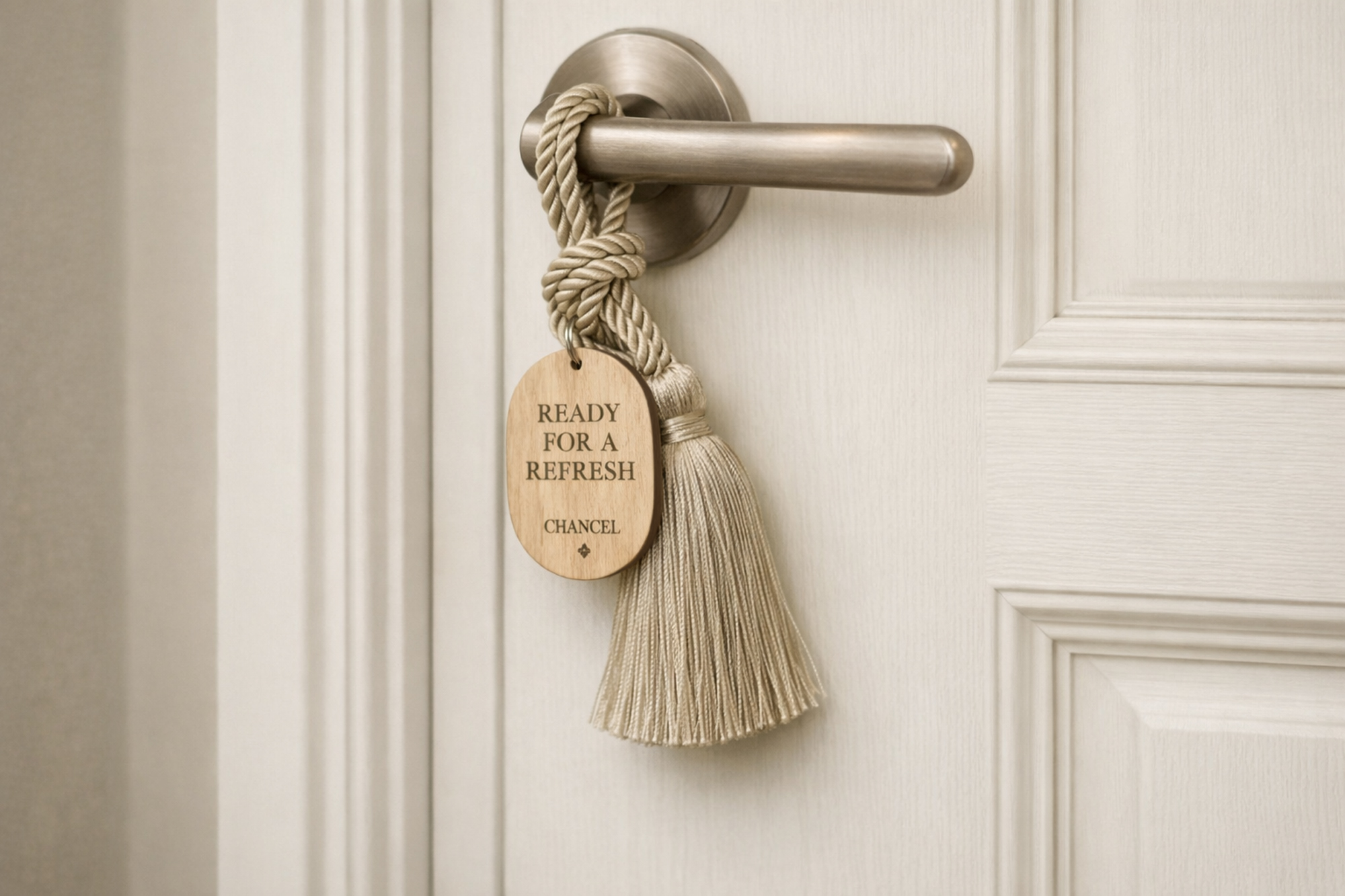 Eksklusive dørhængere til hotelværelser med fyldige kvaster og små træskilte med valgfri tekst. Den elegante kombination af tekstil og træ giver et stilfuldt og indbydende udtryk, samtidig med at gæster nemt kan angive ønsker som f.eks. “Do not disturb” eller “Please clean”.