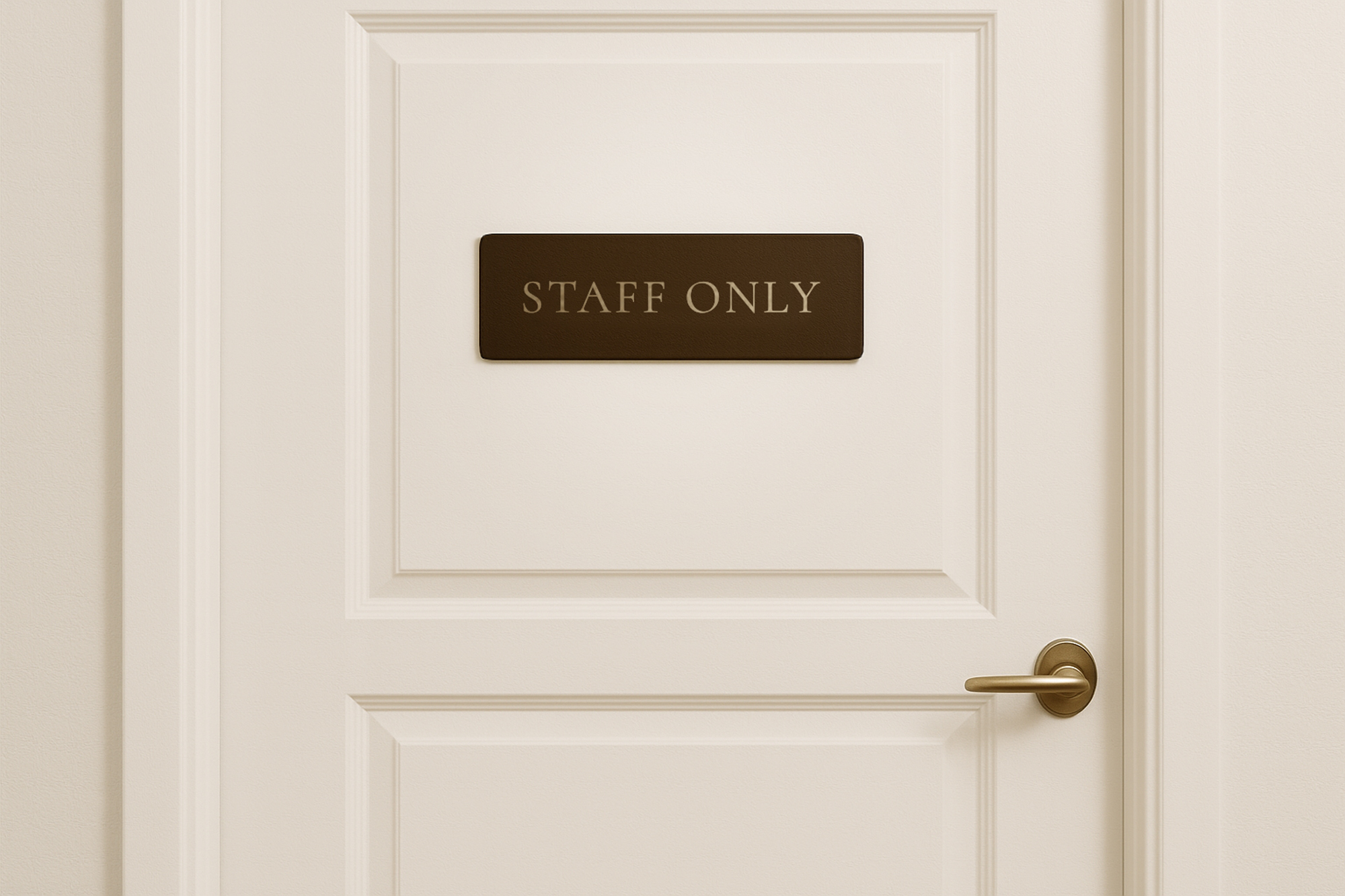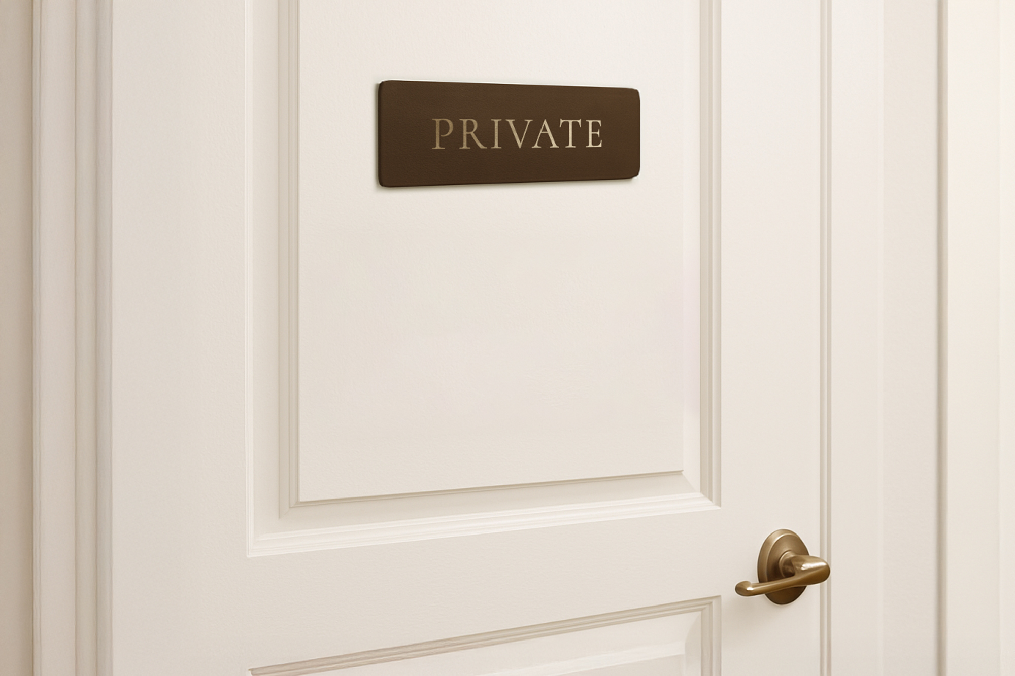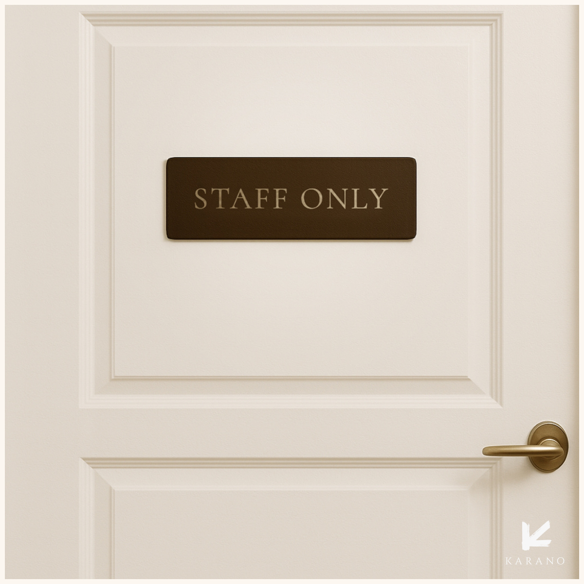 Dørskilte i læder med elegant guldskrift, der giver et eksklusivt og professionelt udtryk. Ideelle til hoteller, kontorer og virksomheder, hvor kvalitet og æstetik er i fokus.