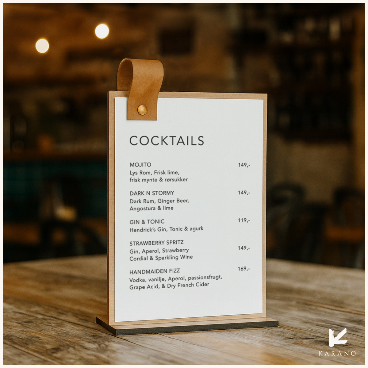 Drinksholder i valgfri træsort med elegant læderstrop i toppen, der fastholder arket på stilfuld vis. Menuen kan nemt udskiftes ved at løsne stroppen, hvilket gør den både praktisk og æstetisk ideel til restauranter, caféer og barer. Logogravering på bagside kan tilføjes.