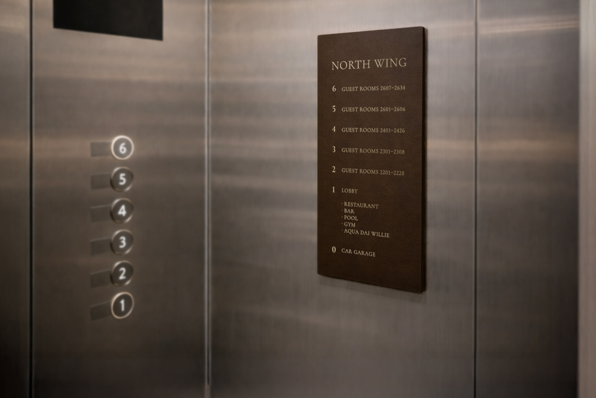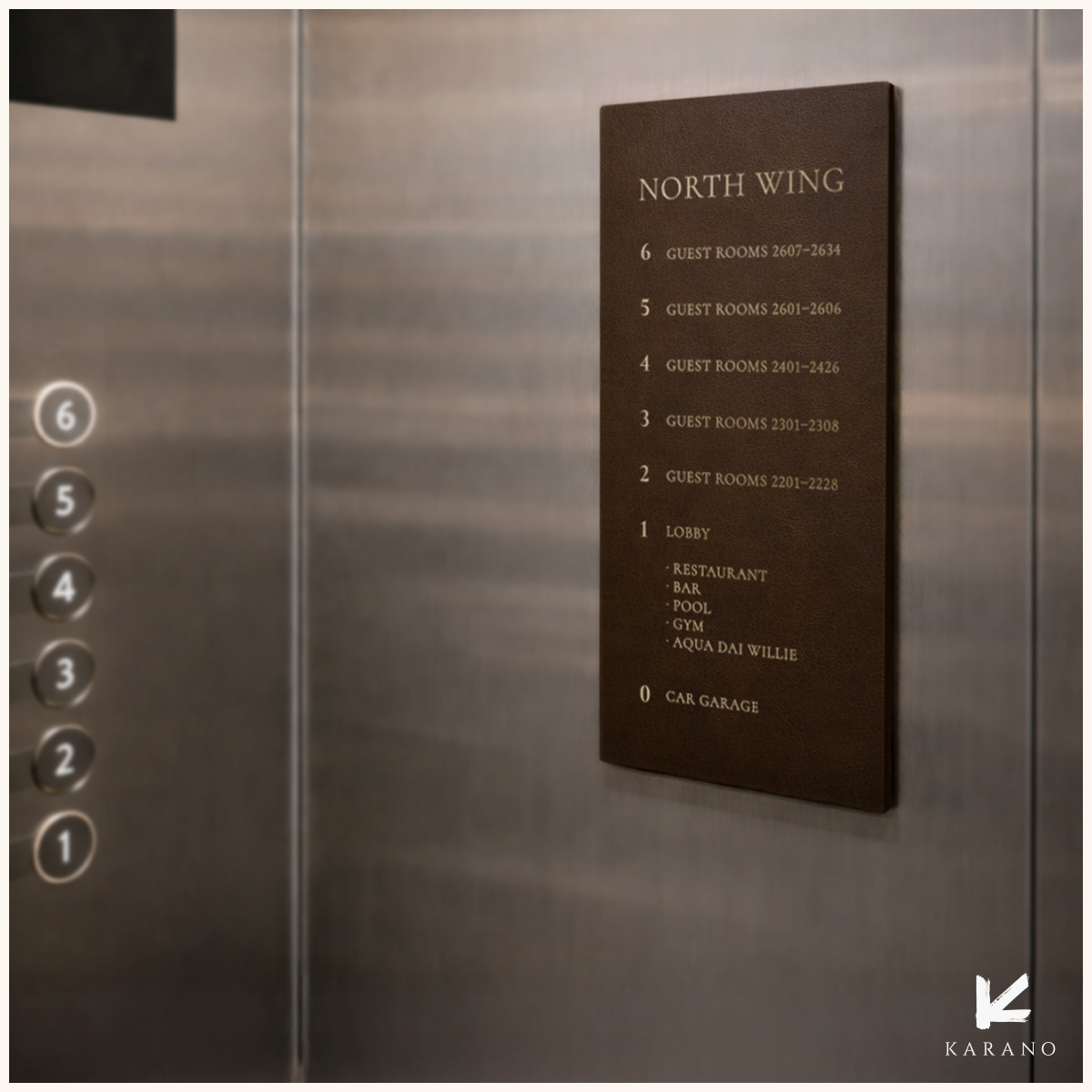 Eksklusivt elevatorskilt i læder med elegant guldskrift og solid bagplade, velegnet til hoteller og virksomheder. Skiltet kan tilpasses med tekst og skrifttype, så det matcher indretningen.
