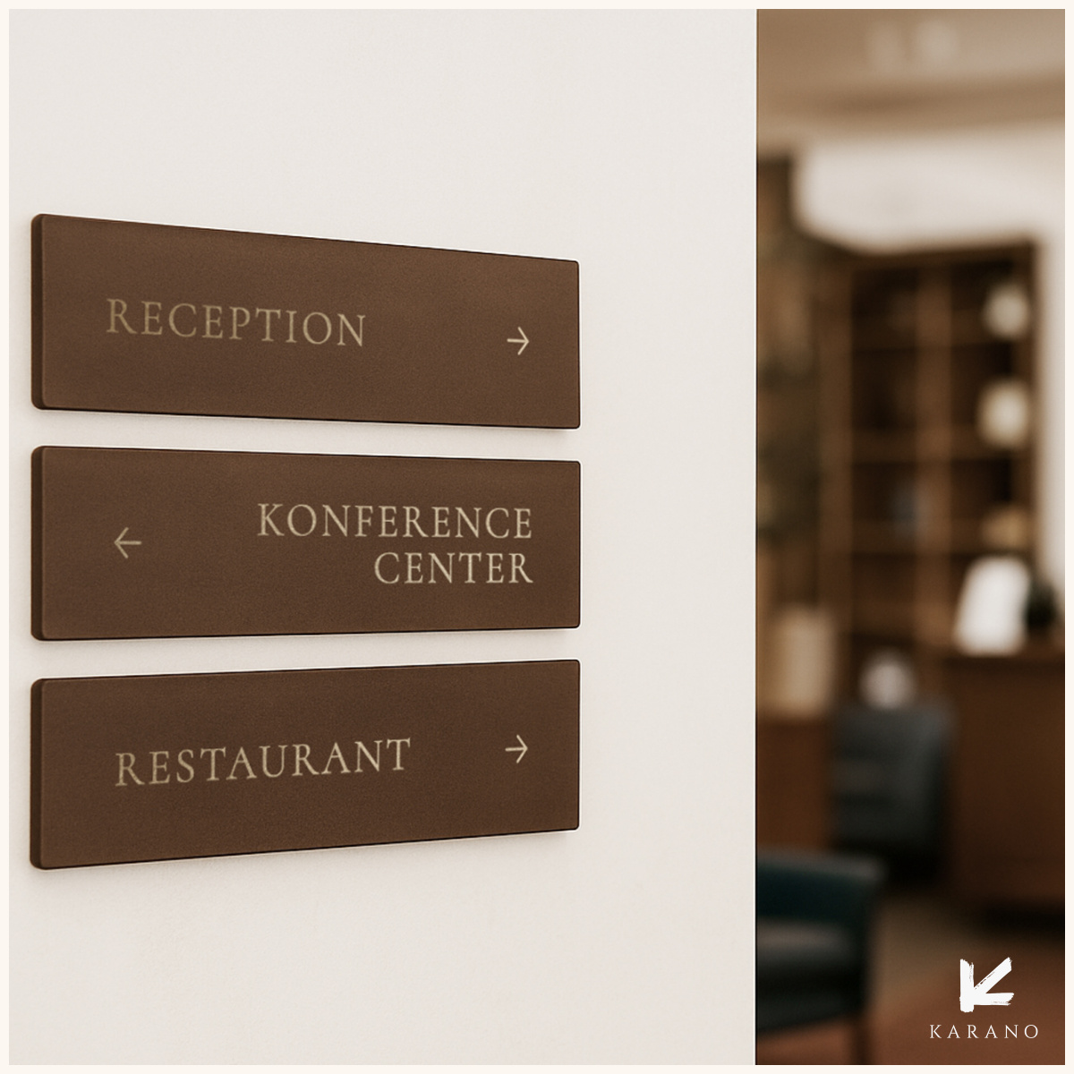 Hotel anvisningsskilte i læder med guld gravering, til elegant og tydelig henvisning til hotellets forskellige faciliteter. Skiltene er udført i høj kvalitet og giver et eksklusivt og sammenhængende udtryk. Oplys venligst pilretninger for hvert skilt.