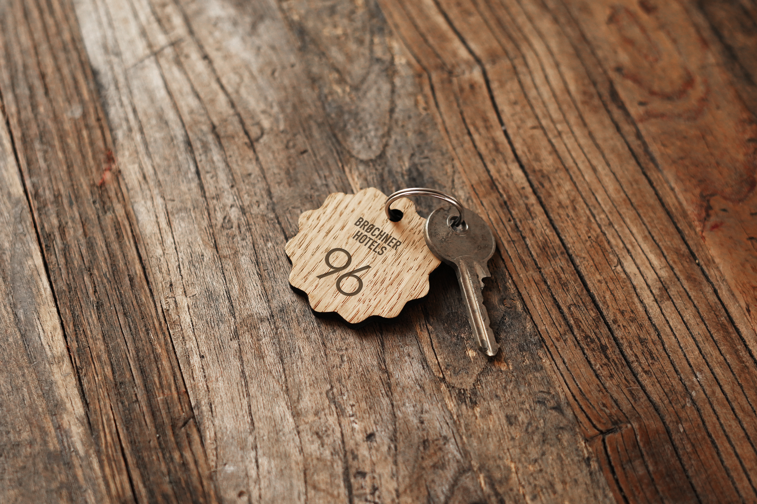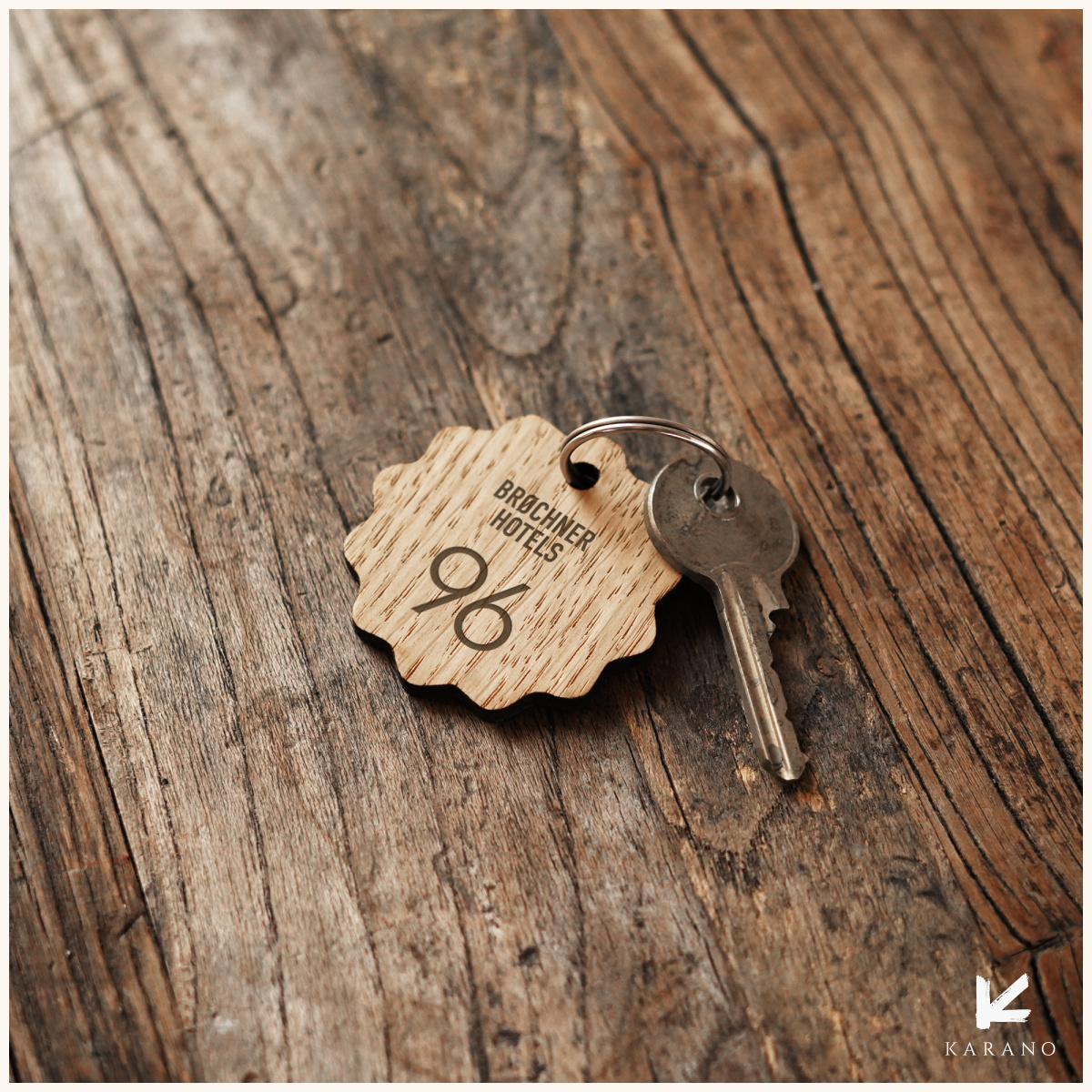 Unikke nøgleringe med bølgekant, fremstillet i massivt træ. Perfekte til hoteller, graveret med logo eller værelsesnummer for et elegant og personligt udtryk.