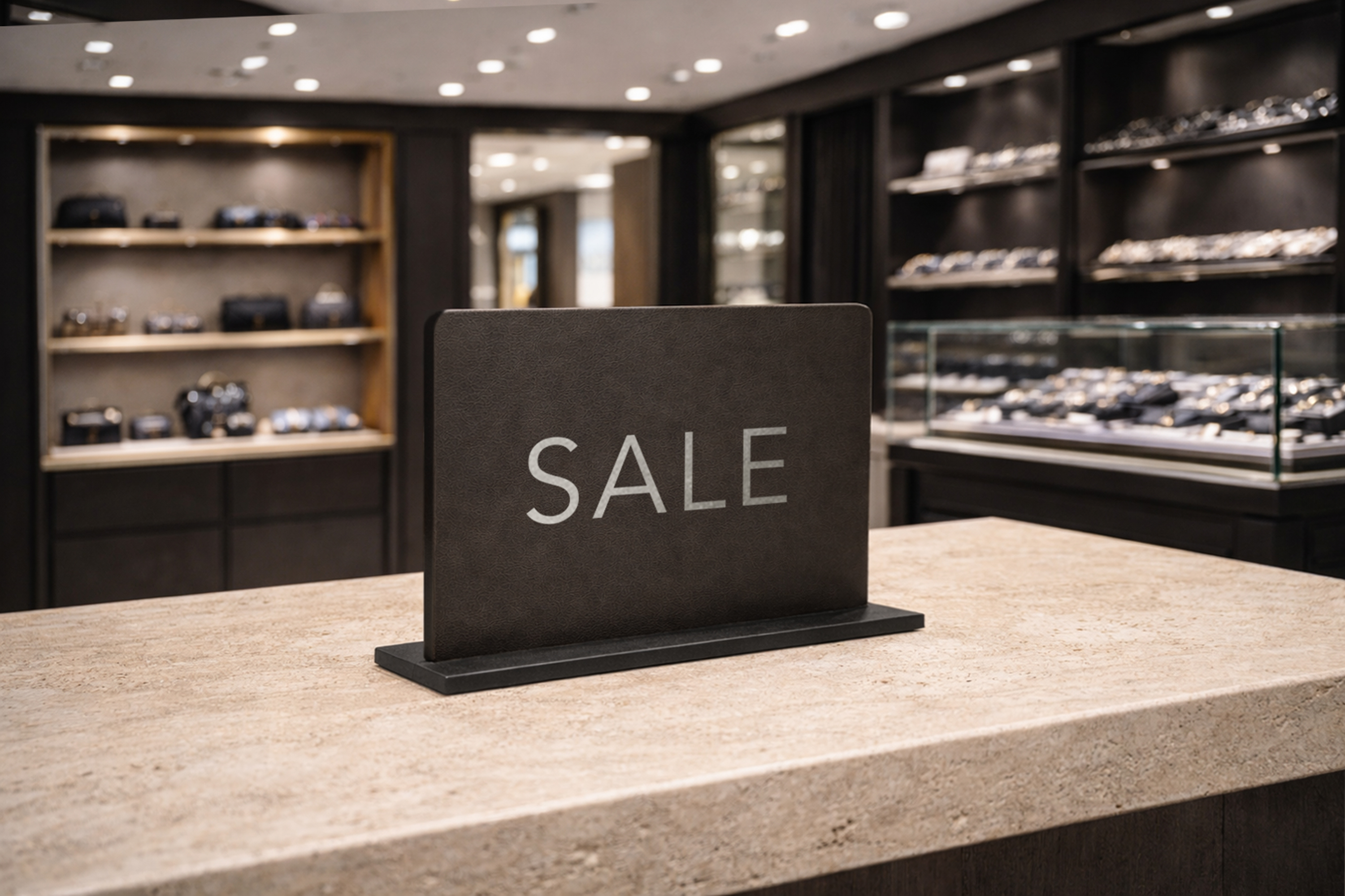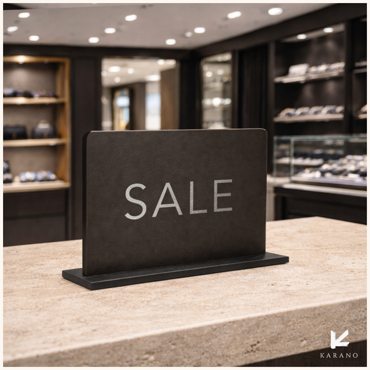 Info- og udsalgsskilte i læder med sølvskrift giver butikken et eksklusivt og stilrent udtryk. Skiltene skaber et moderne look, der tiltrækker opmærksomhed og understreger kvalitet og detaljer.