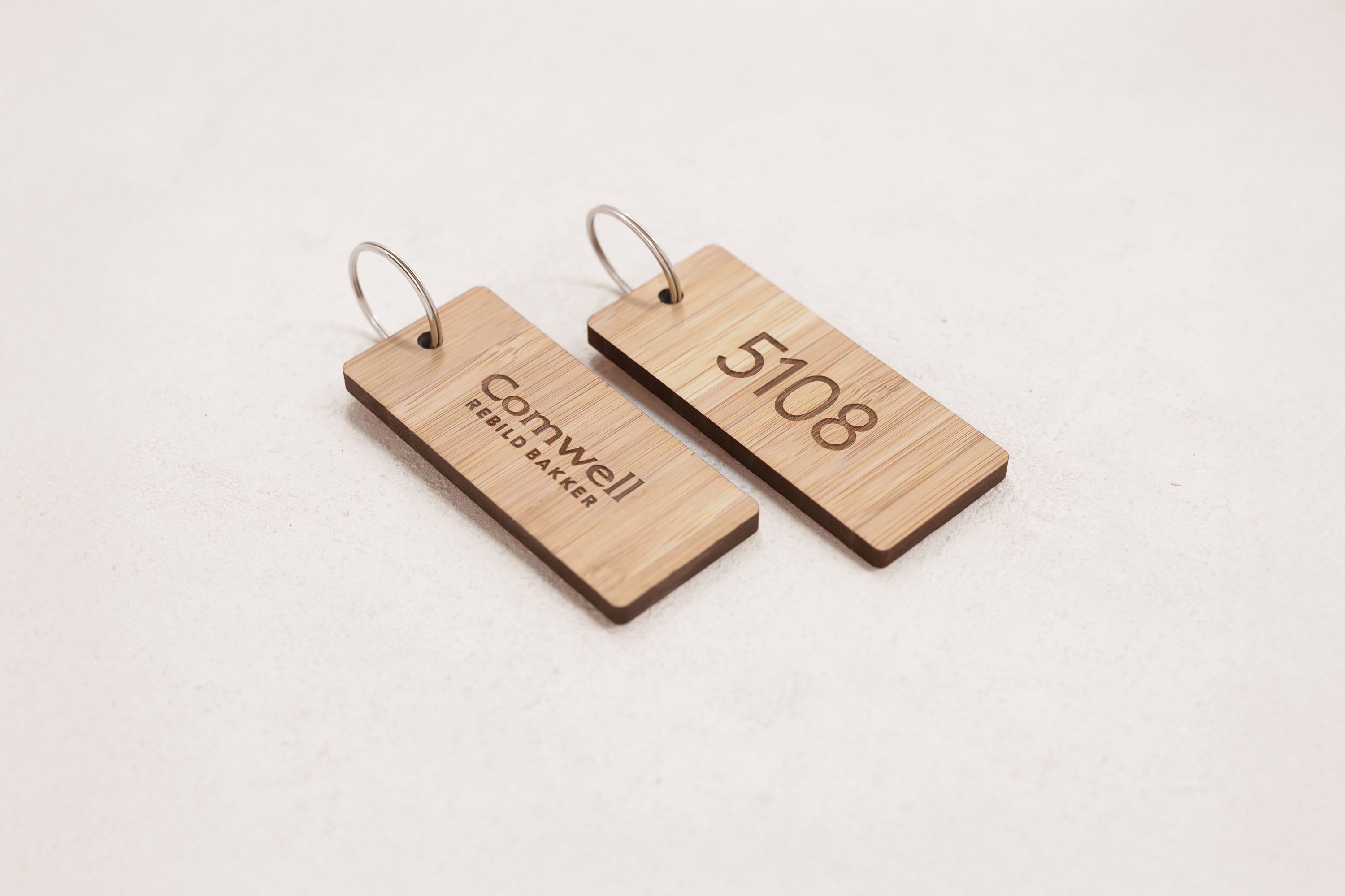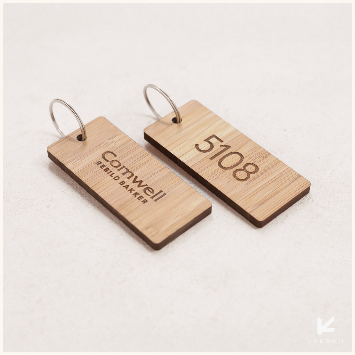 Klassiske hotel-nøgleringe i træ med mulighed for valgfri tekst og logo. En elegant og holdbar løsning, der understøtter hotellets visuelle identitet og giver gæsterne en gennemført oplevelse.