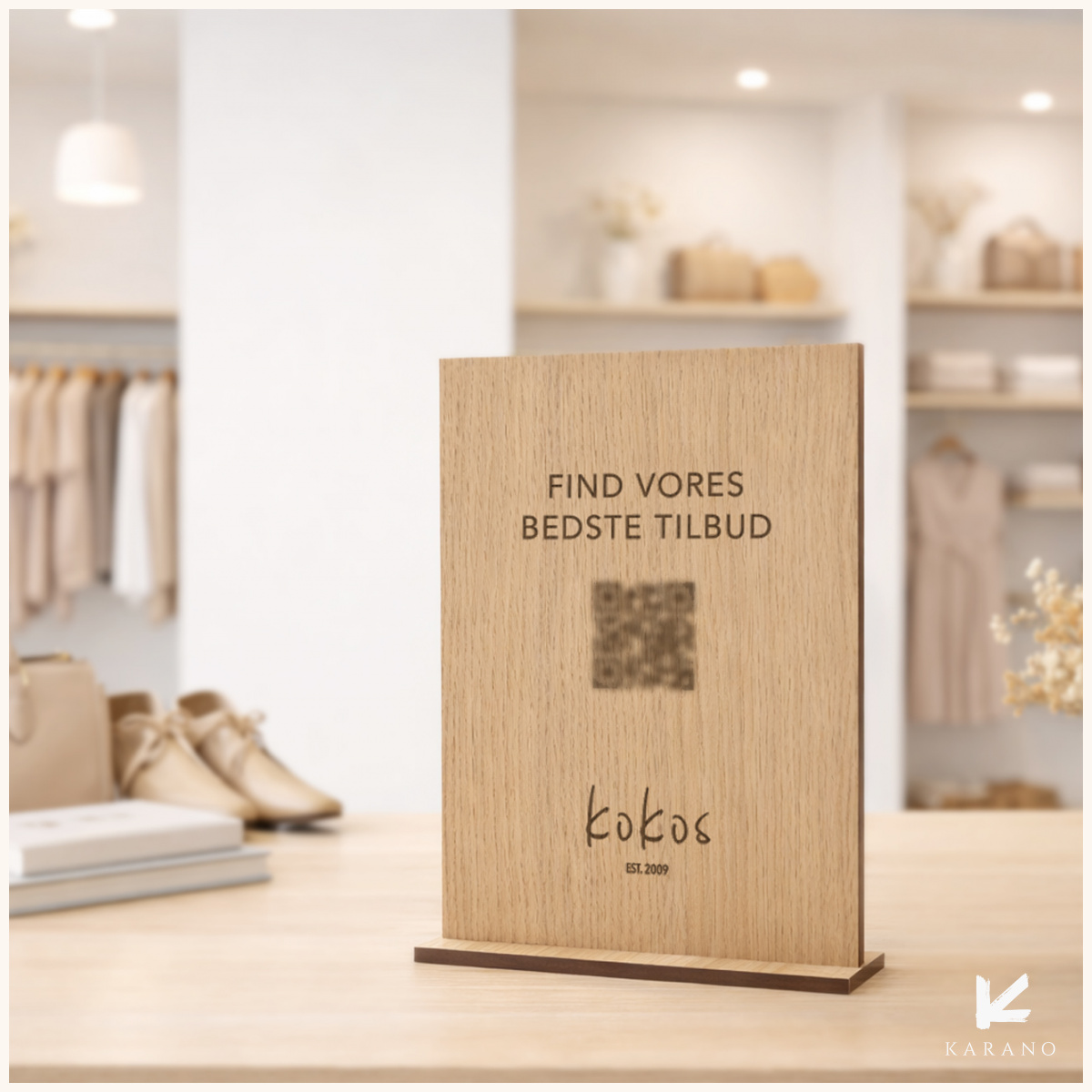 Lodret QR-skilt i træ til butik, der kombinerer funktionalitet med et stilrent og eksklusivt udtryk. Skiltet kan graveres med QR-kode og egen tekst.