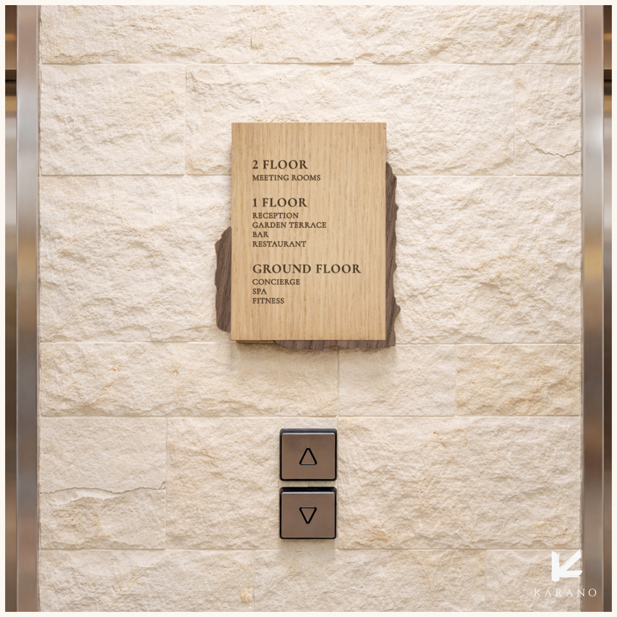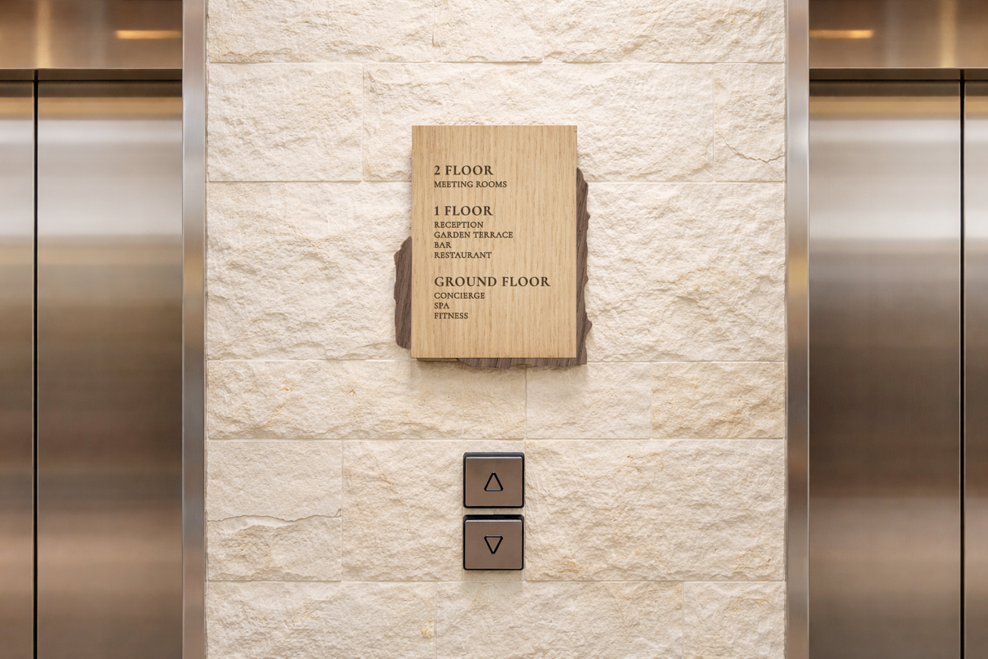 Organiske etageskilte i træ til hotelgange og lobby skaber en sammenhængende og eksklusiv atmosfære. De bløde former og det naturlige træ giver et roligt, nordisk udtryk og tydelig skiltning i hele hotellet.