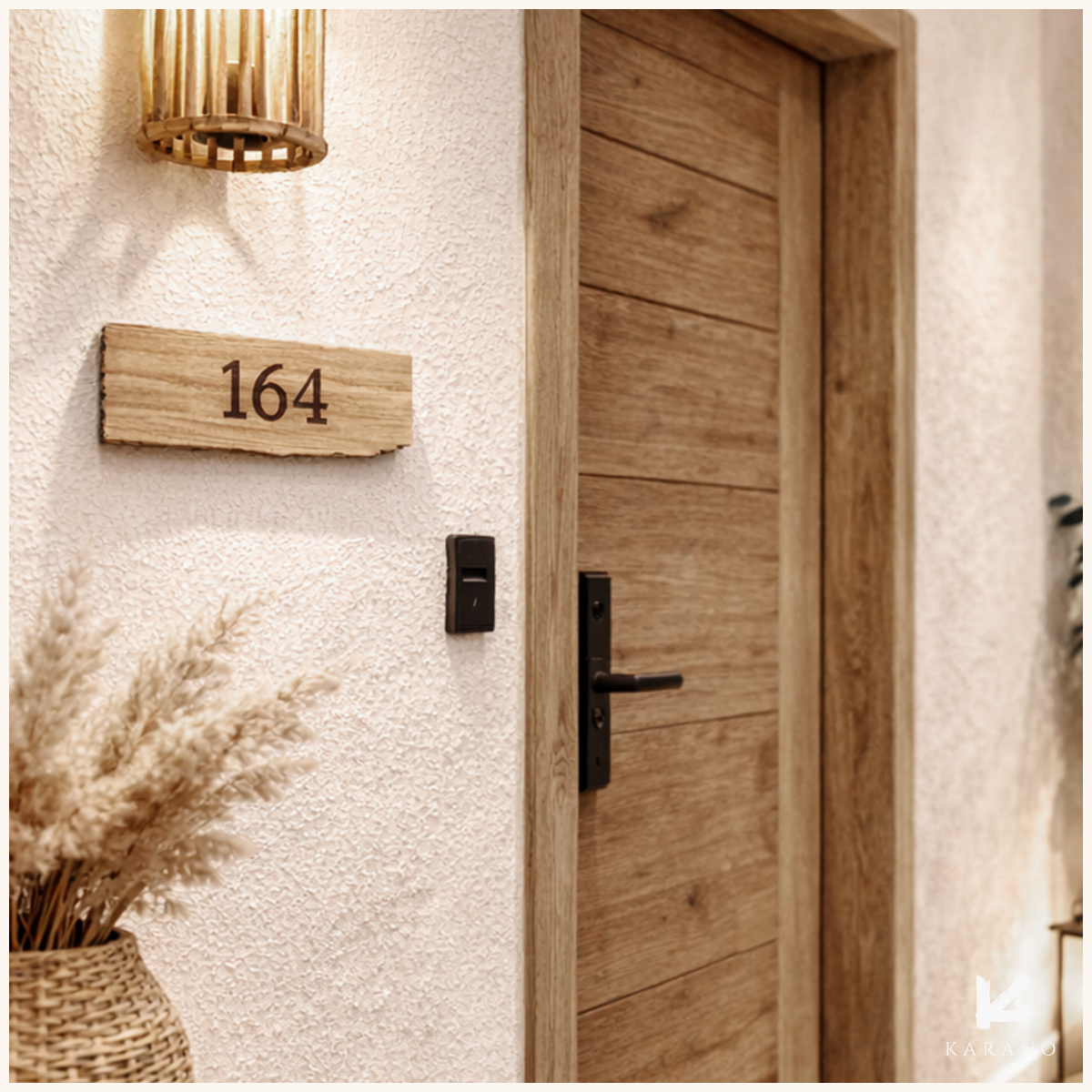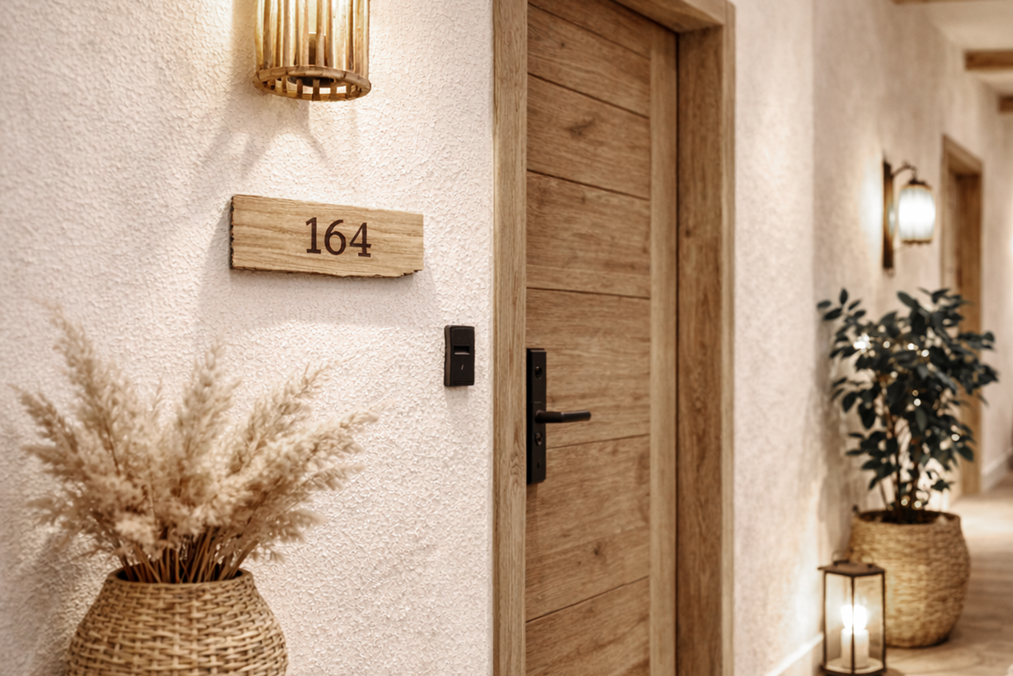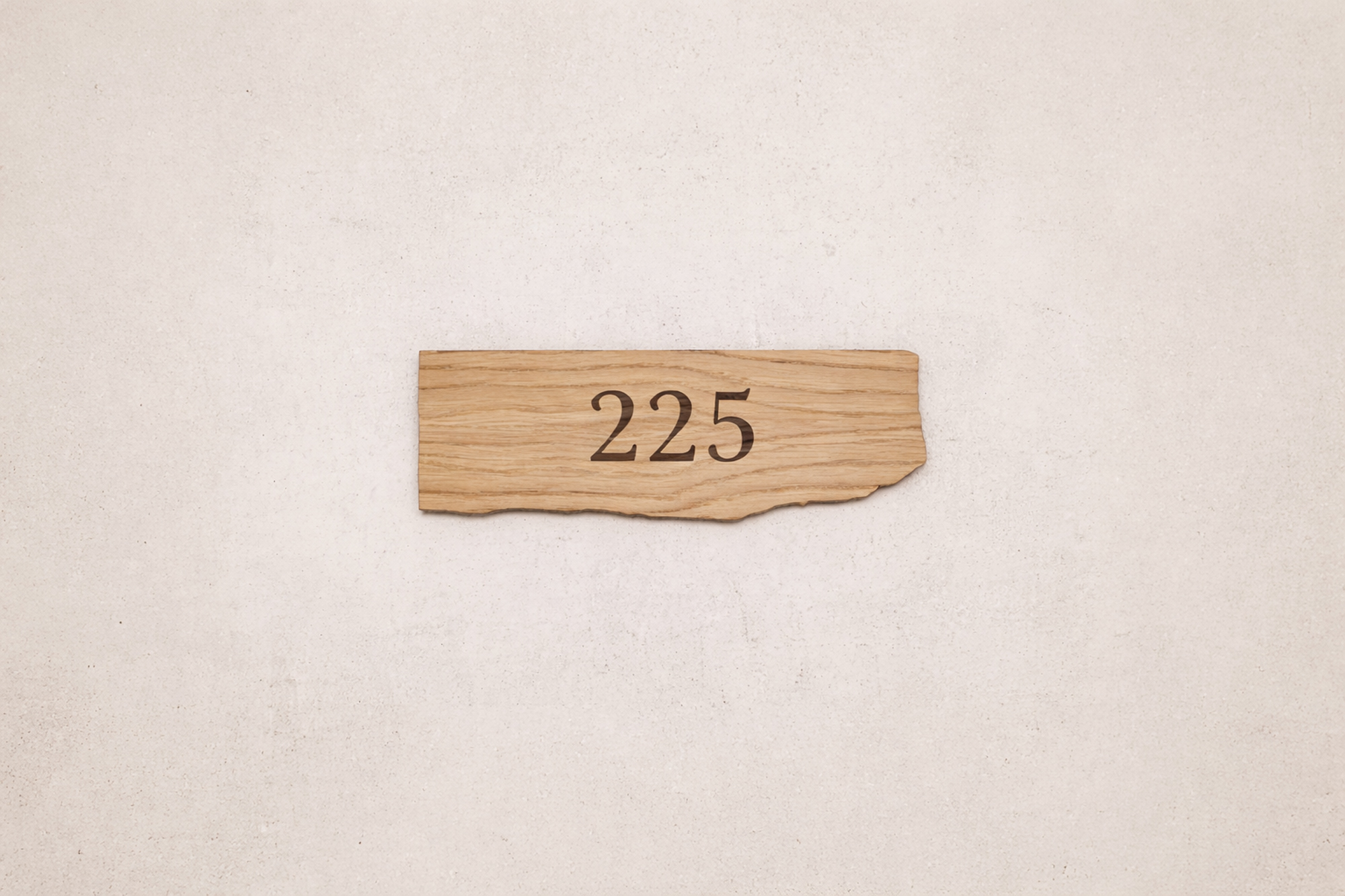 Organiske hotelværelsesnumre i træ giver et varmt og eksklusivt udtryk. De bløde former og den naturlige åretegning skaber et roligt, nordisk look med personlig karakter.