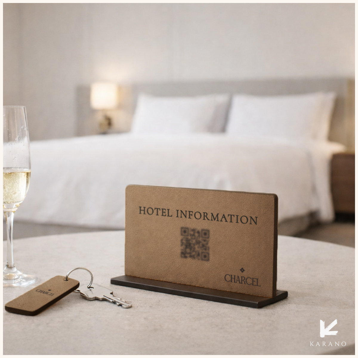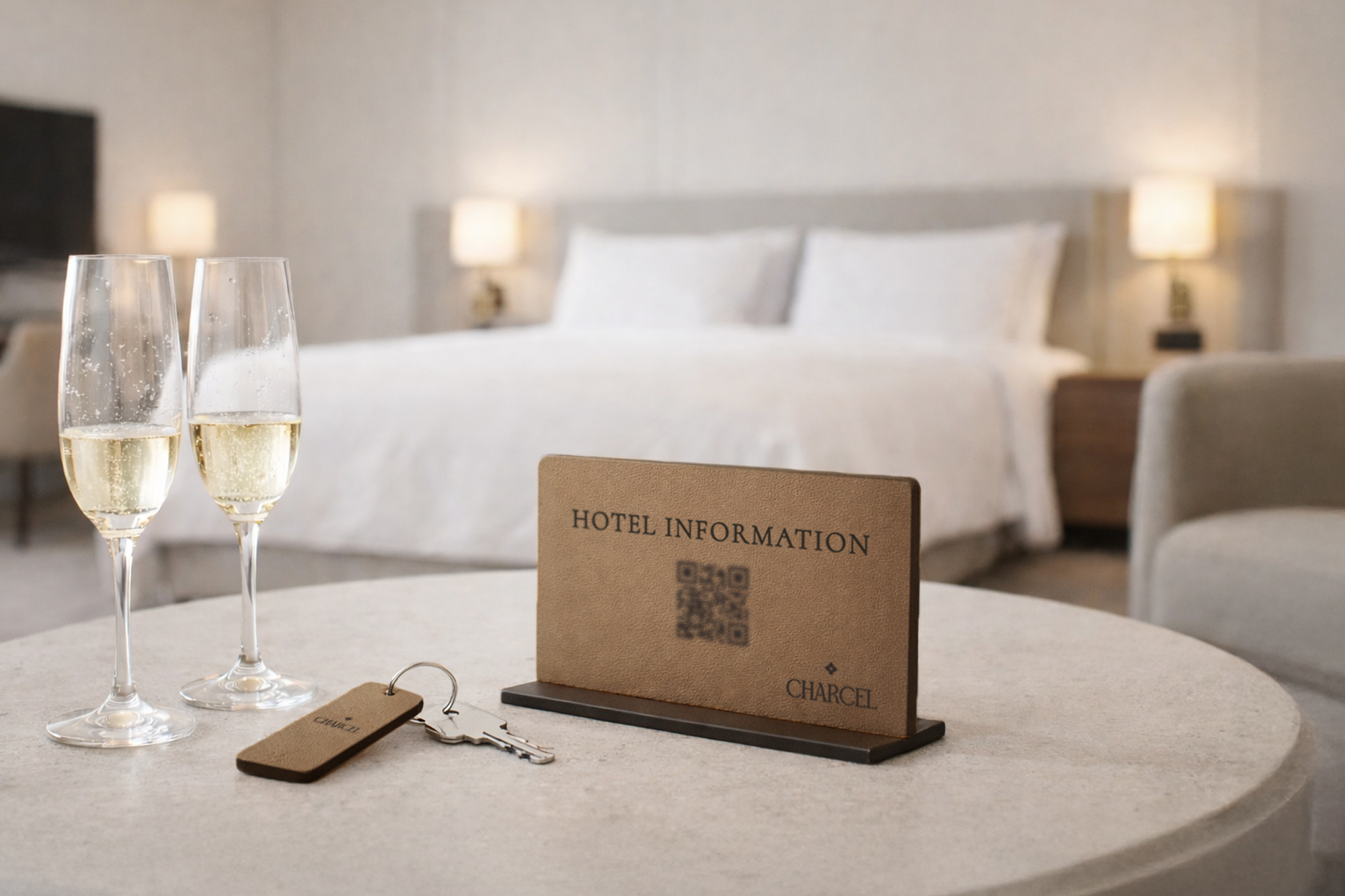 Små QR-kode skilte i læder til hotelværelser – en elegant og praktisk løsning til kontaktløs adgang til hotellets services, menukort, WiFi og gæsteinformation. Fås med logo og valgfri tekst.