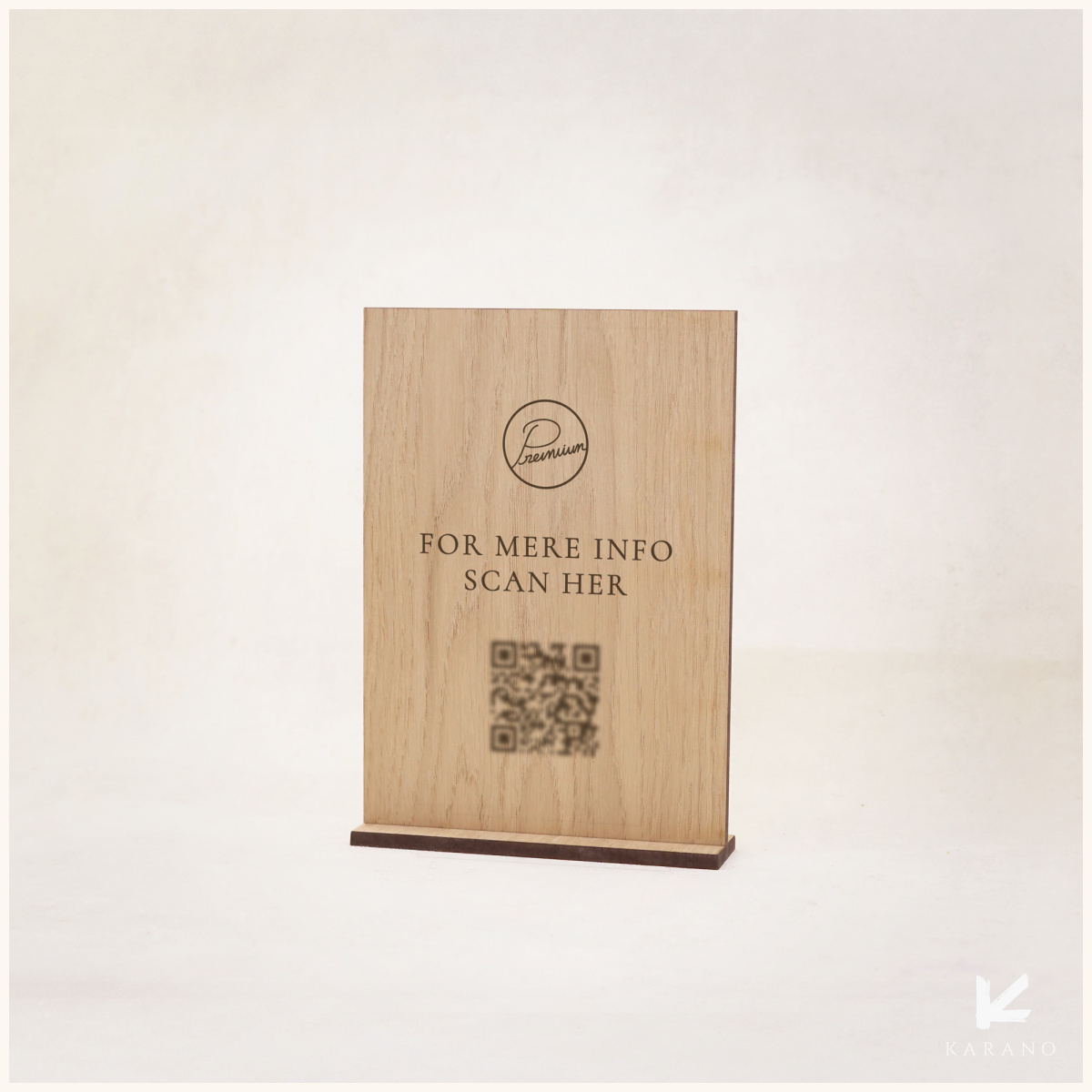 QR-kode infoskilt i træ – et elegant og funktionelt skilt, der giver gæster nem adgang til informationer som roomservice, wi-fi, åbningstider eller kontaktoplysninger. Fremstillet i naturligt træ med graveret QR-kode og mulighed for logo eller tekst.