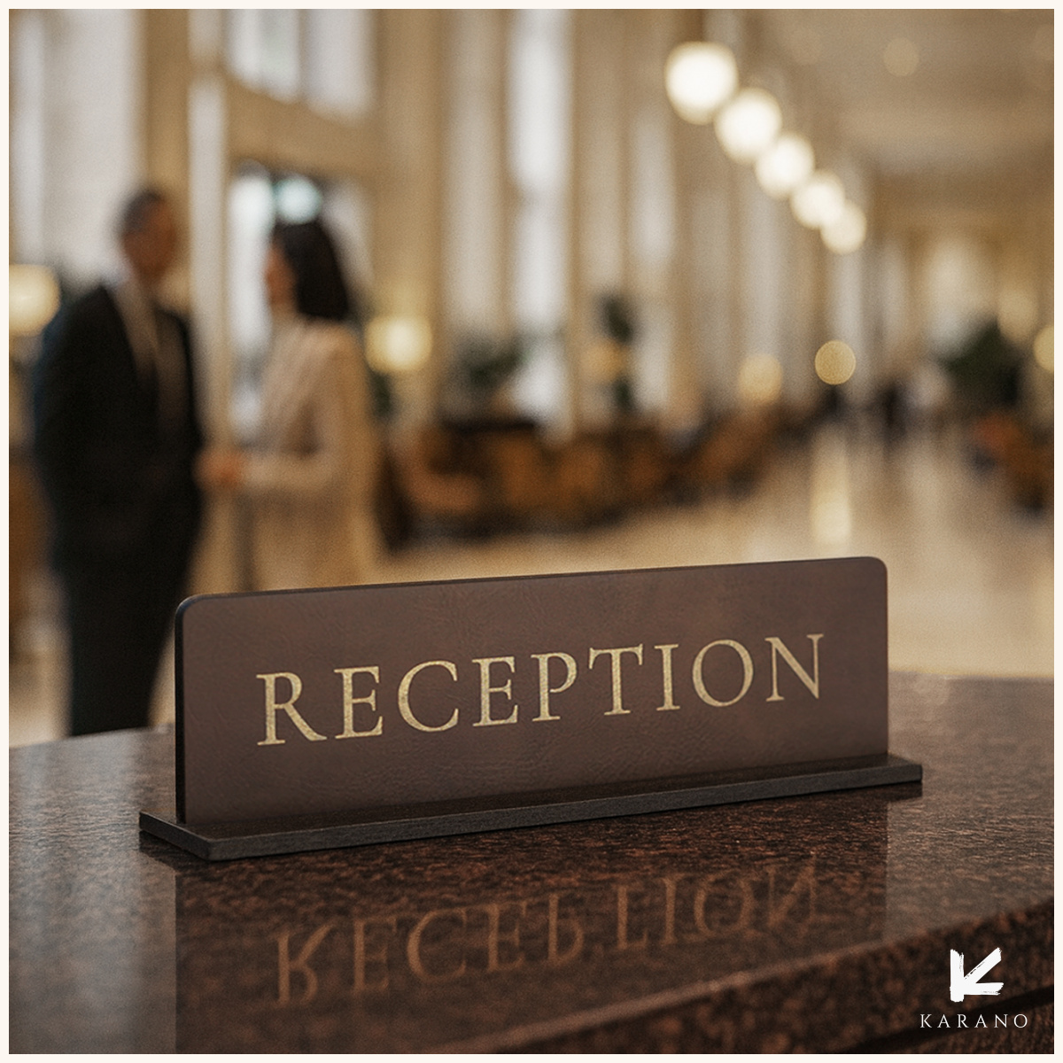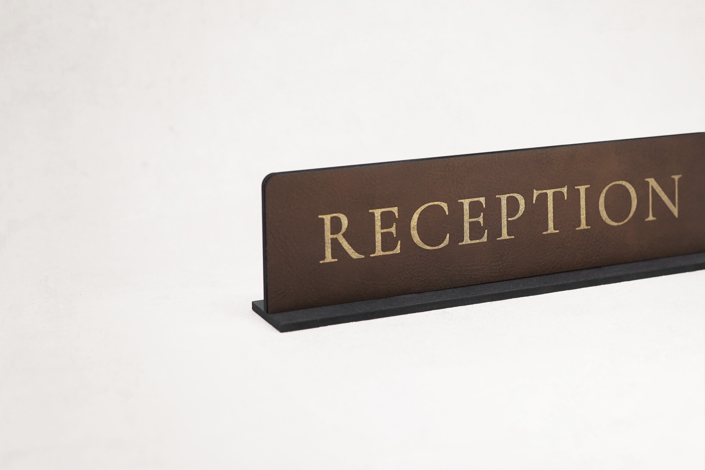 Elegant og professionelt receptionsskilt fremstillet i læder med smuk graveret guldfarvet tekst. Leveres med praktisk holder, så skiltet står stabilt og synligt på receptionens skranke.