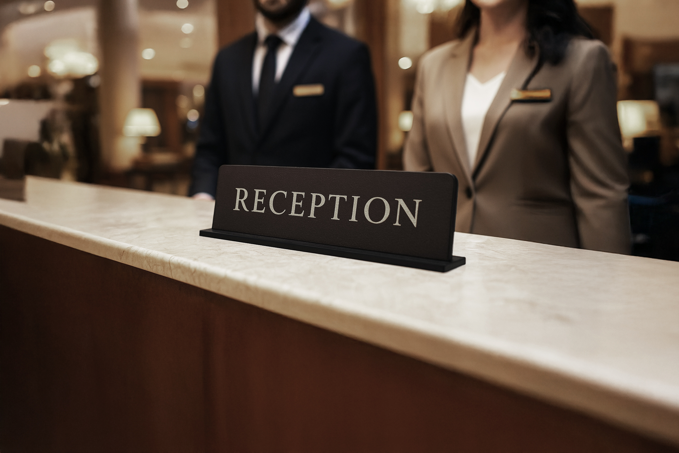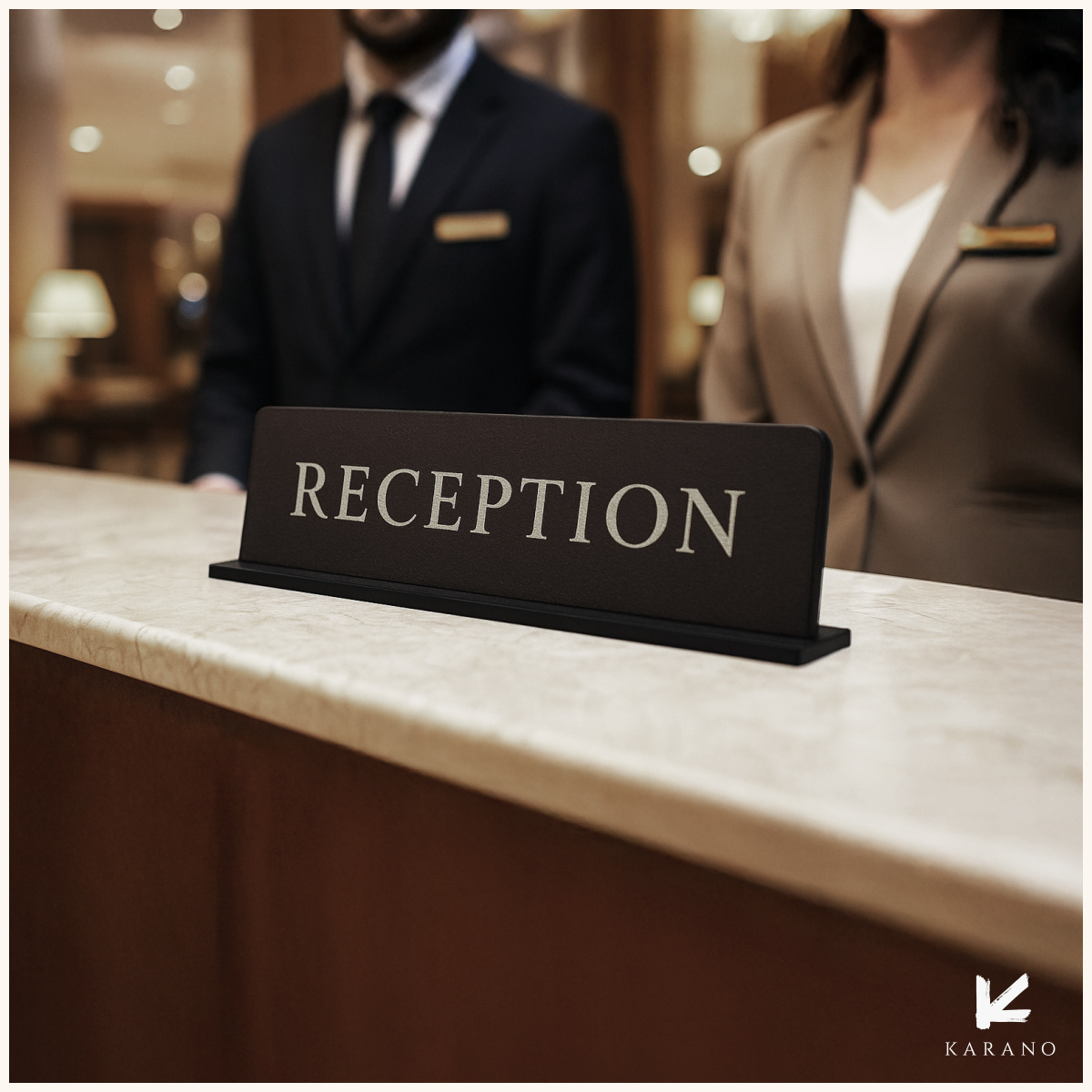 Reservationsskilte i sort læder med graveret sølvskrift, designet til restauranter og hoteller, der ønsker et eksklusivt og professionelt udtryk og en tydelig markering af de reserverede borde.
