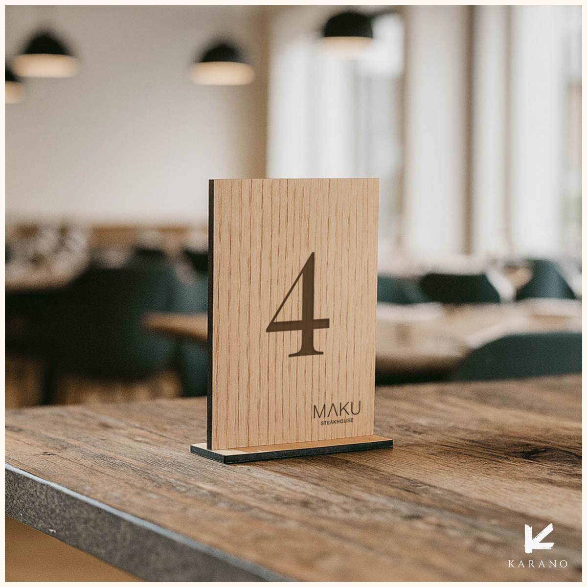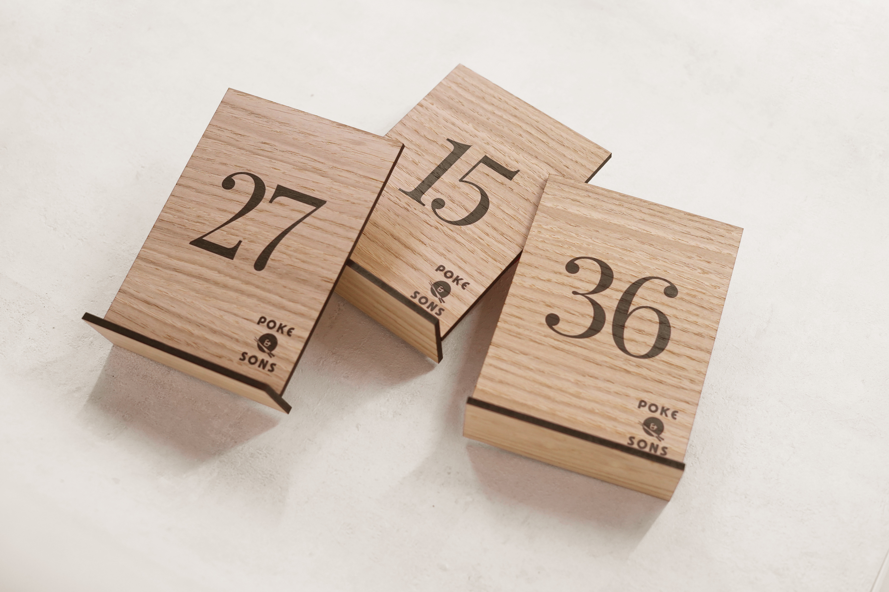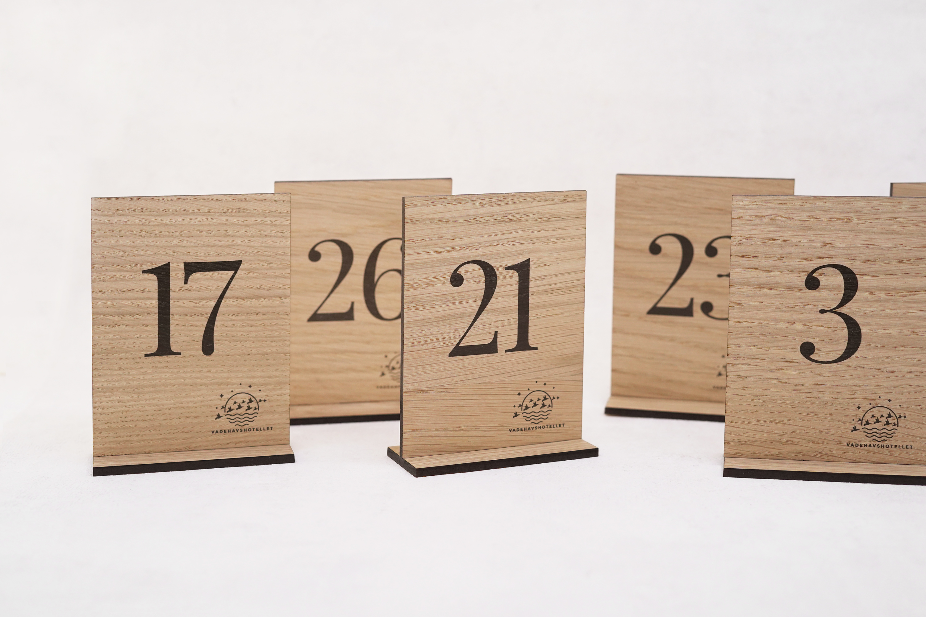 Stilrene bordnumre i træ med enkle fødder og graverede tal – og mulighed for logo, hvis ønsket. Skabt i høj kvalitet med fokus på funktion, holdbarhed og et naturligt udtryk.