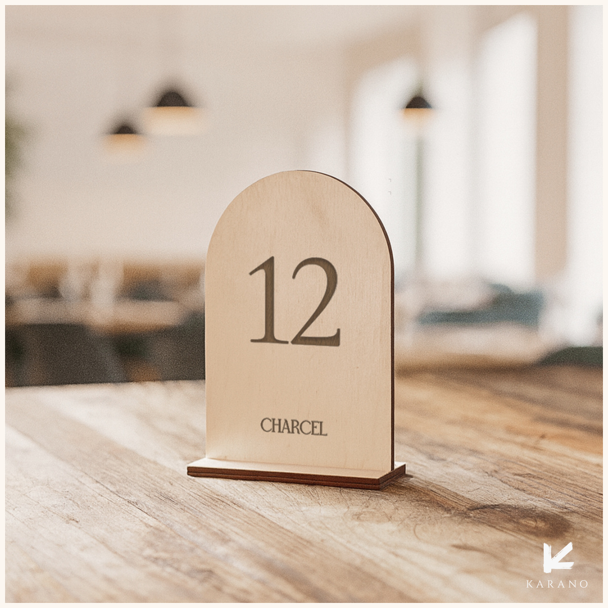 Elegante bordnumre i valgfri træsort med buet form og præcis gravering af nummer og evt. logo – perfekt til restauranter, caféer og hoteller, der ønsker et naturligt og stilrent udtryk.