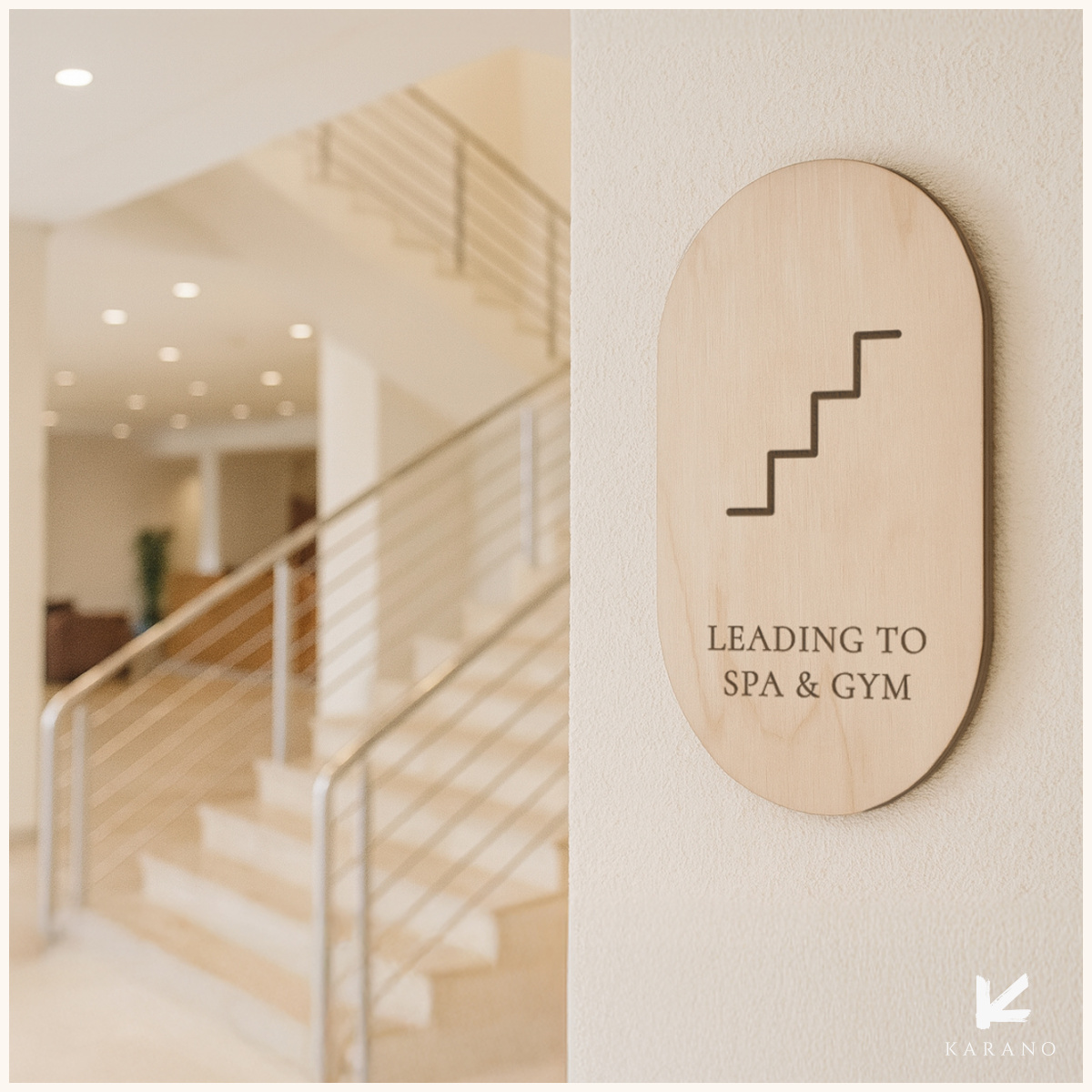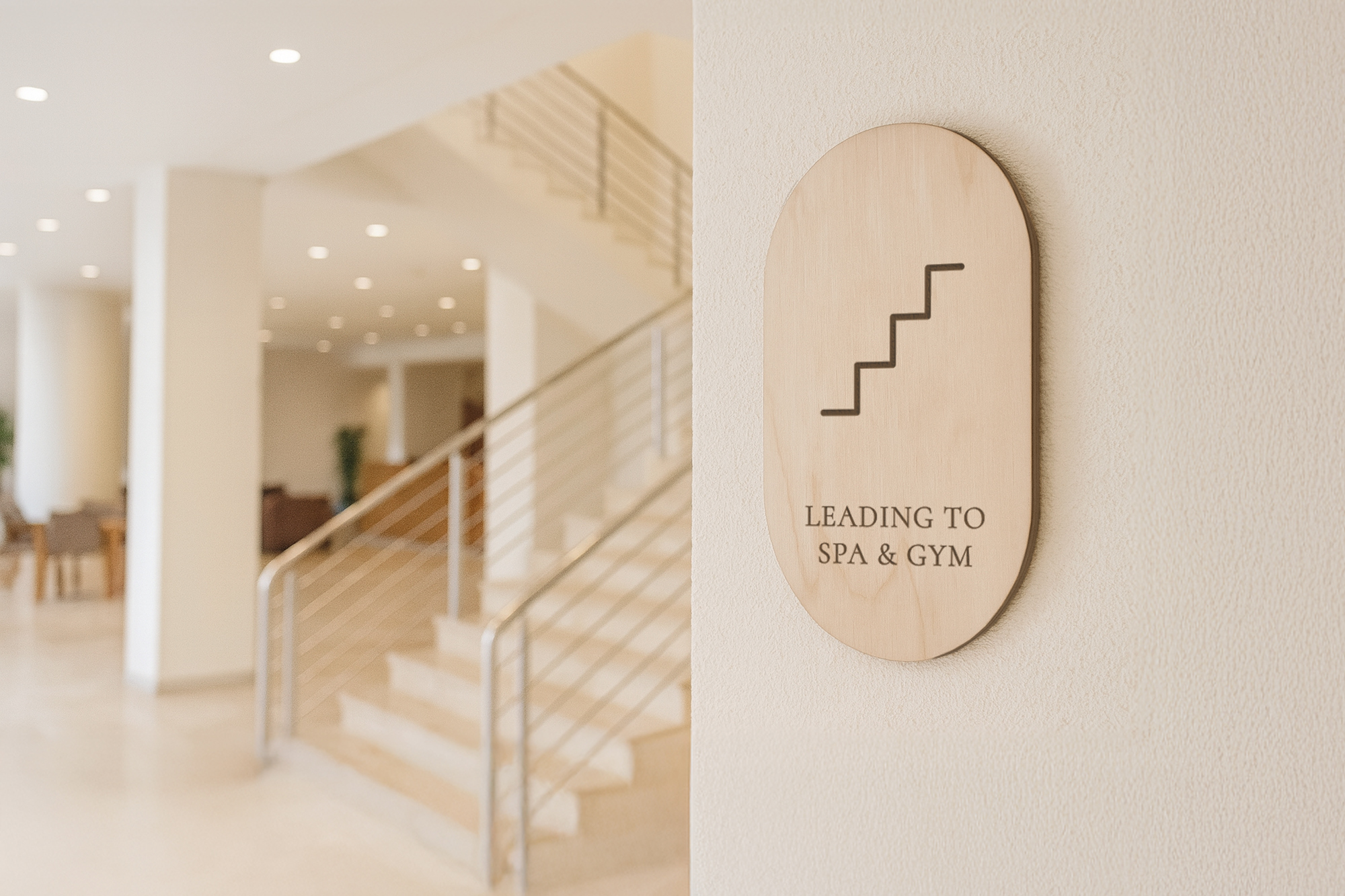Retningsskilt til hotel, designet til placering ved trapper, så gæster nemt kan finde vej til værelser, faciliteter og etager. Skiltet fremstilles i et stilrent og eksklusivt udtryk, der passer ind i hotellets indretning.