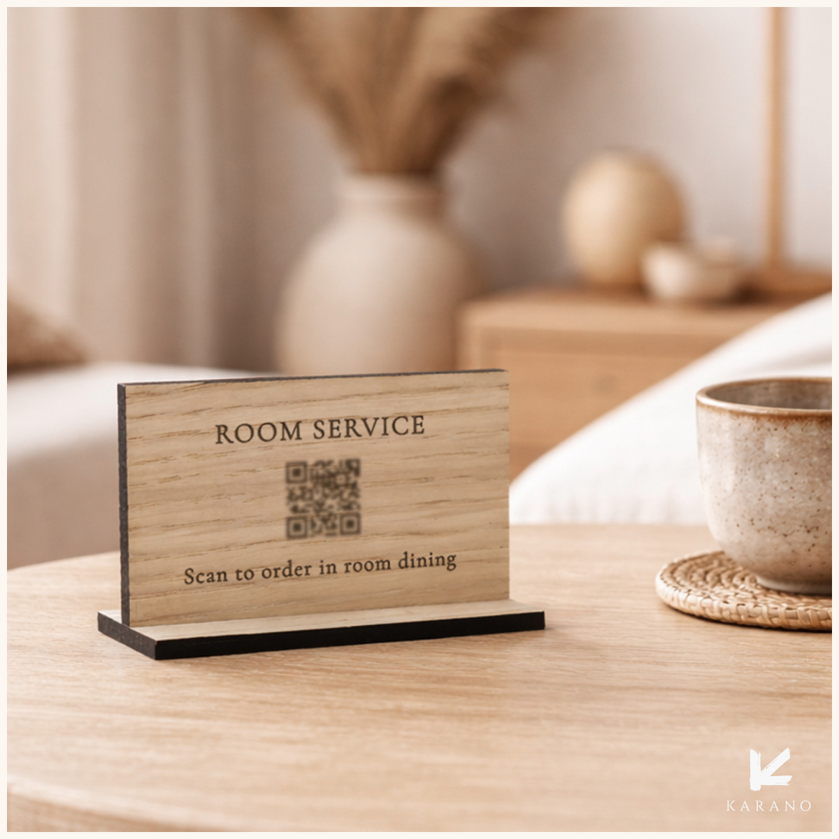 Room service skilte til hotelværelser giver gæster en enkel og elegant måde at bestille på. Det naturlige træ skaber et varmt og eksklusivt udtryk, samtidig med at QR-koden gør bestillingen hurtig og nem.