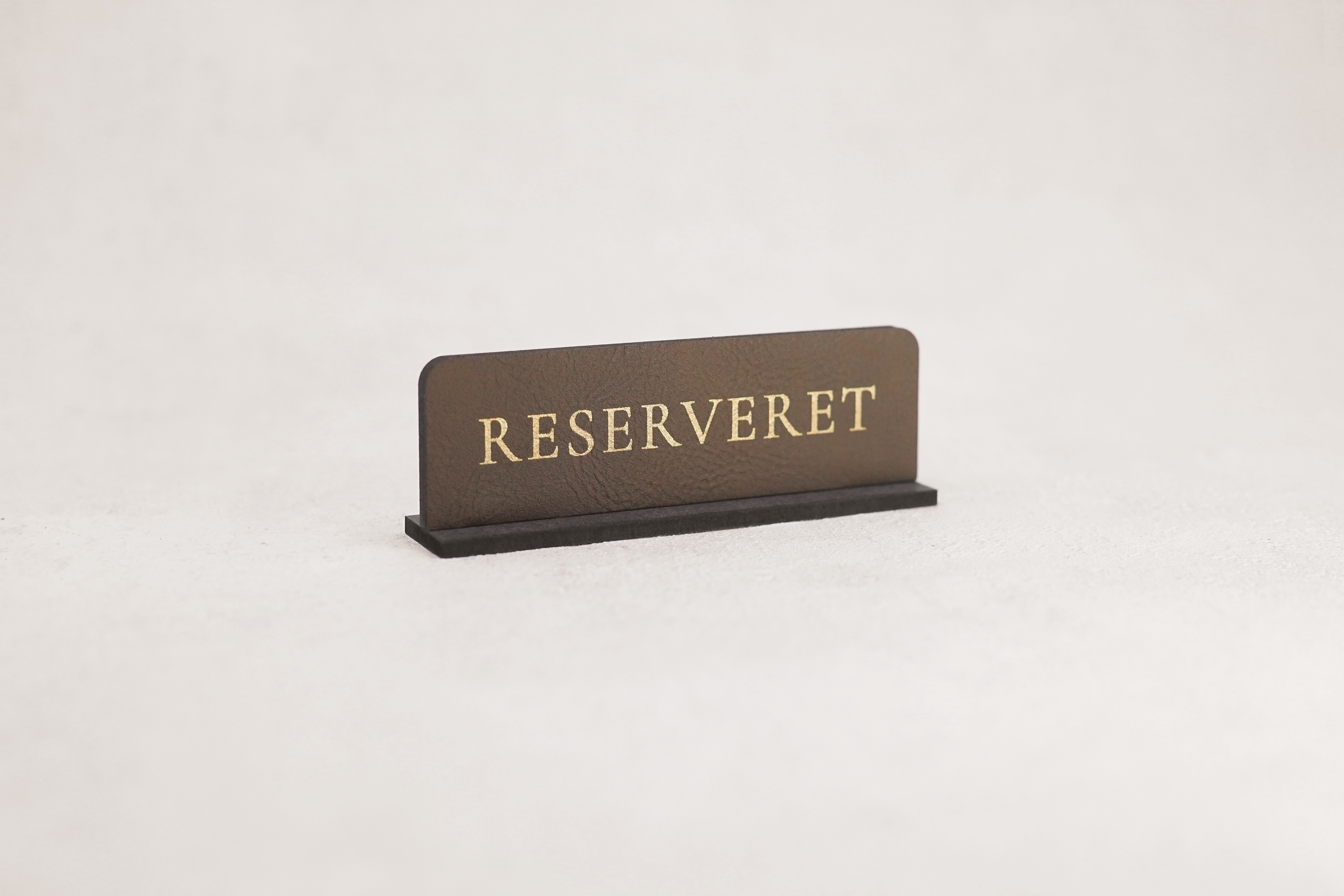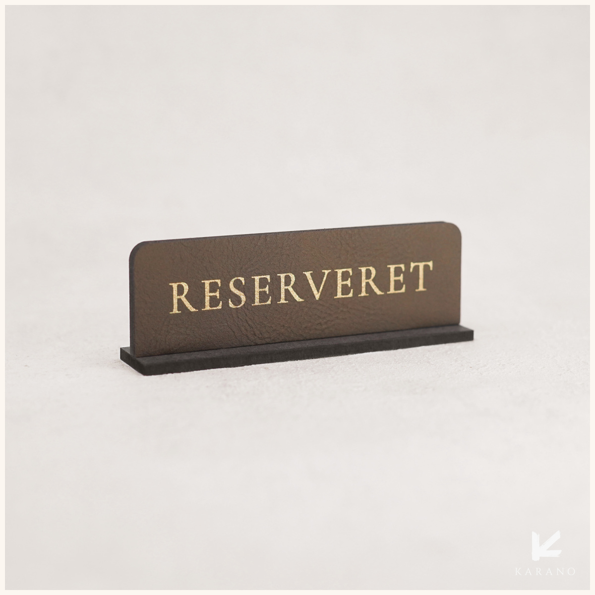 Elegante reservationskilte i mørkebrunt læder med graveret guldskrift, perfekt til restauranter og hoteller, der ønsker et eksklusivt, stilrent udtryk og en luksuriøs detalje til borddækningen.