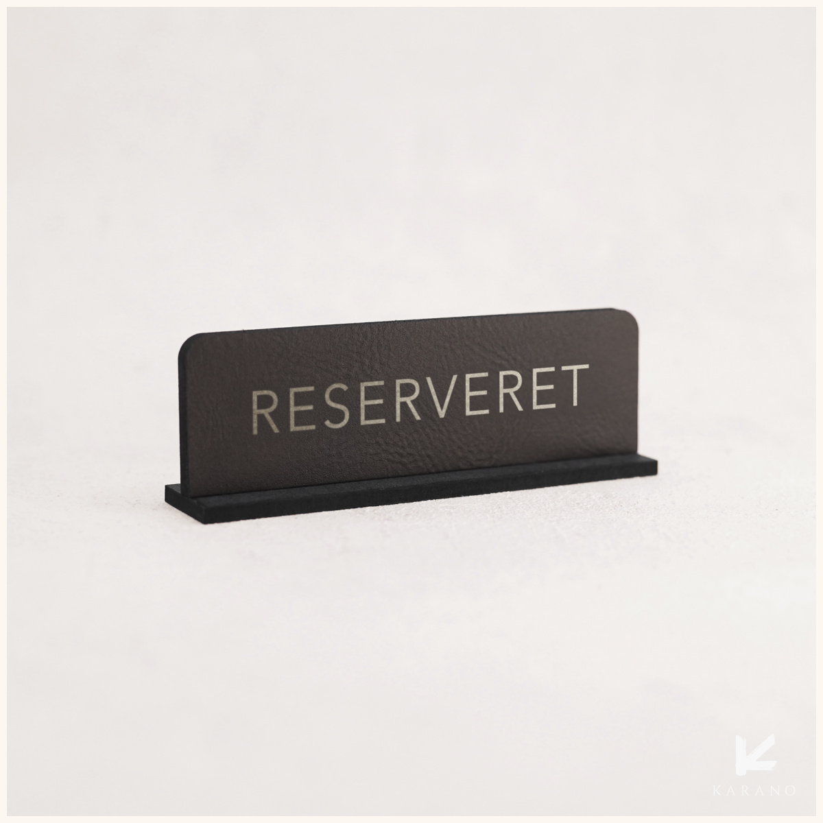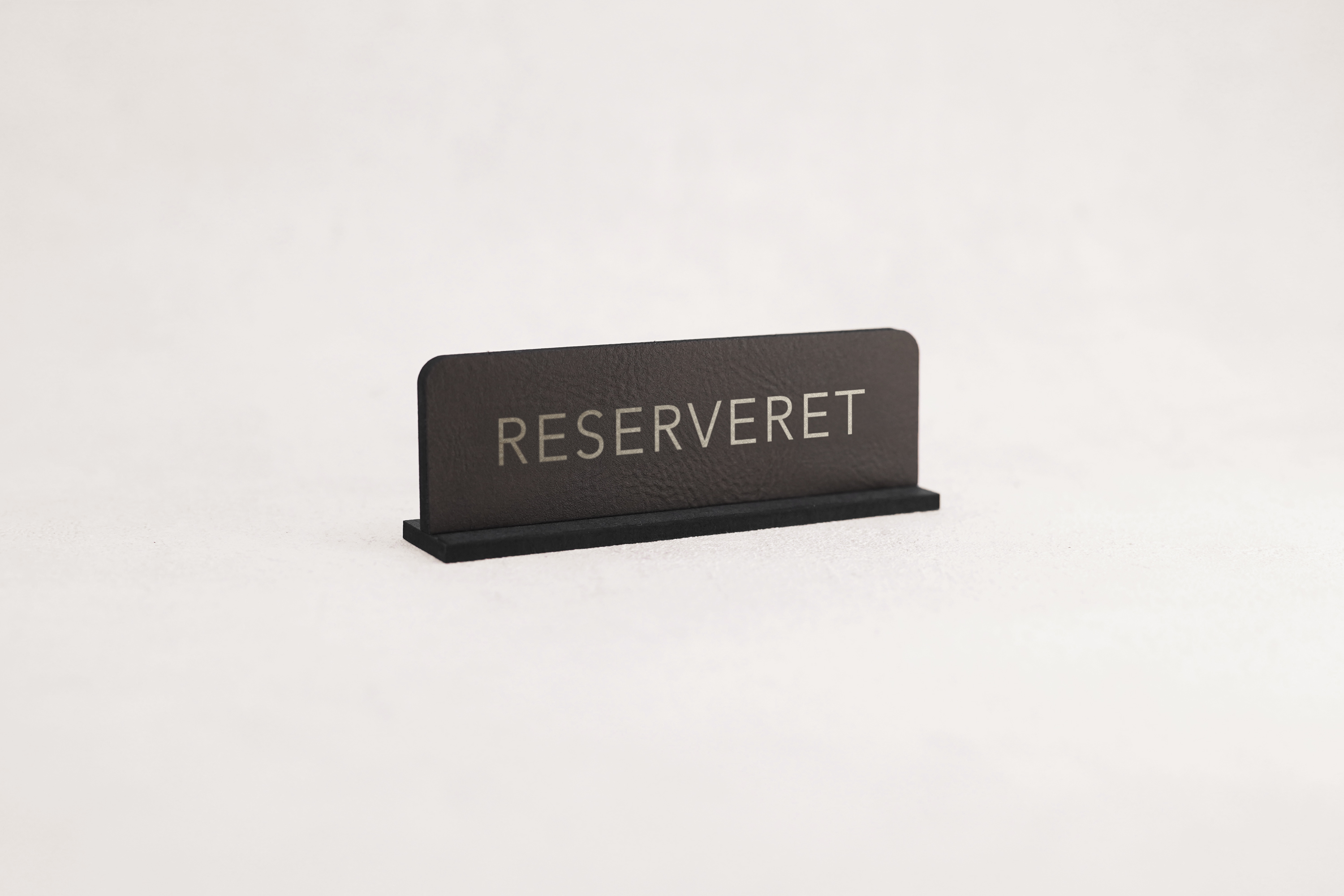 Reservationsskilte i sort læder med graveret sølvskrift, designet til restauranter og hoteller, der ønsker et eksklusivt og professionelt udtryk og en tydelig markering af de reserverede borde.