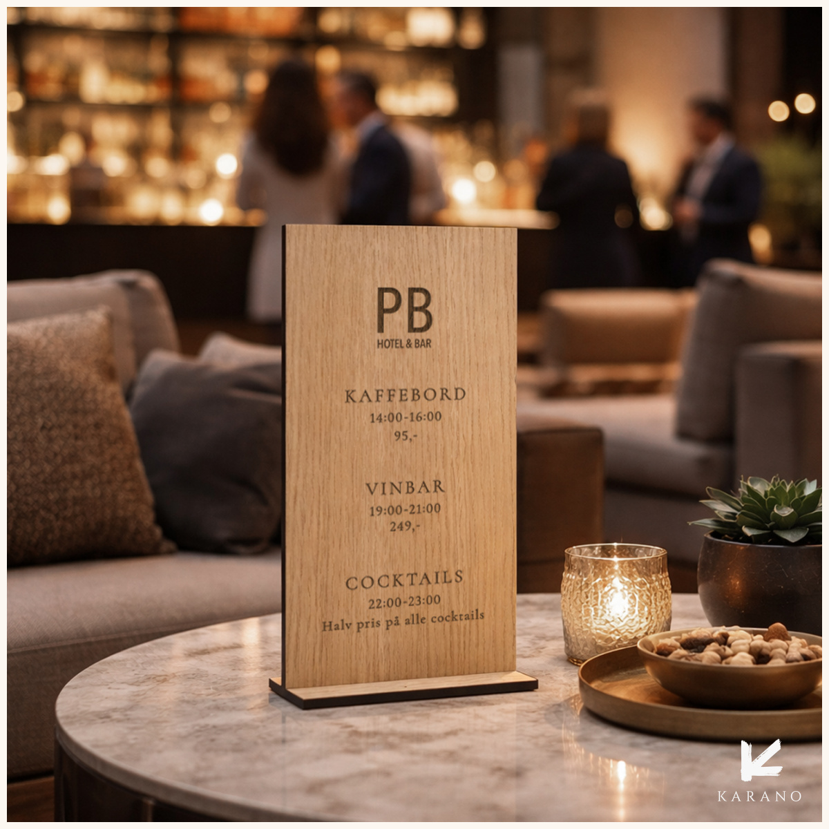 Bordskilte i træ med information om særlige tilbud og events, f.eks. kaffebord i bestemte tidsrum, vinbar eller halv pris på cocktails. Ideelle til restaurant, bar og lounge – også velegnede til happy hour, live music, tasting events, brunch, afternoon tea og temaaftener.