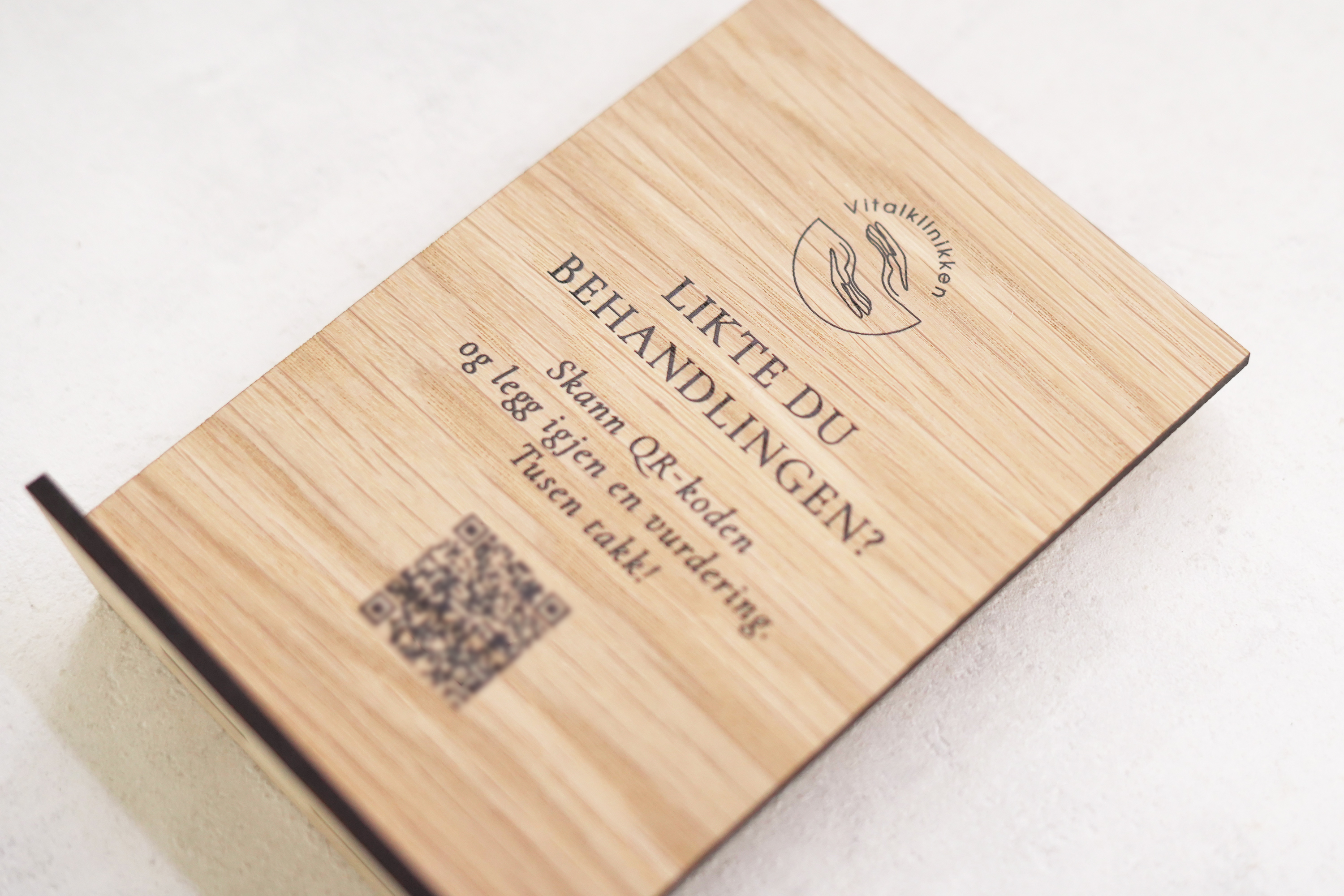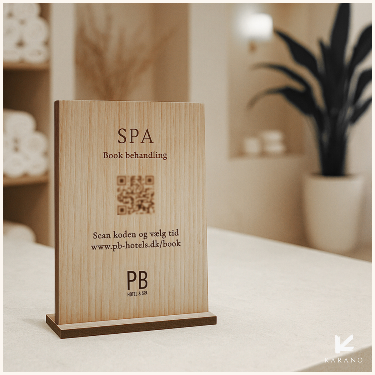 Spa booking-skilt med QR-kode i træ, elegant og rolig i udtrykket, designet til at lede gæster nemt videre til online booking. Graveret med egen tekst og logo i ønsket træsort og udformning, så det matcher spaens æstetik og atmosfære.