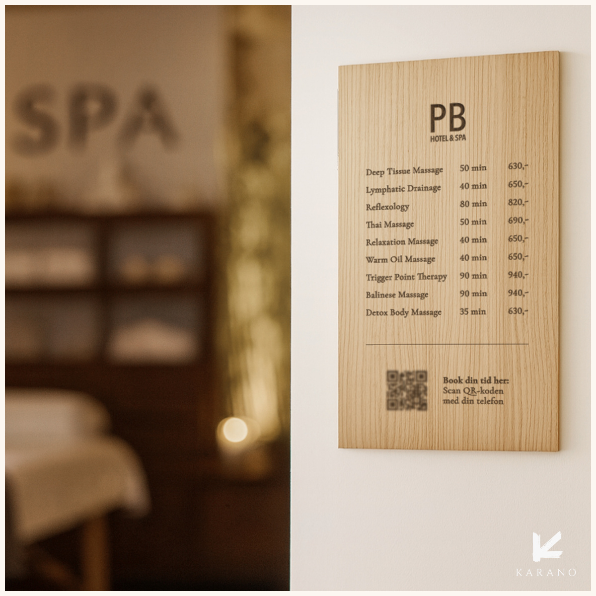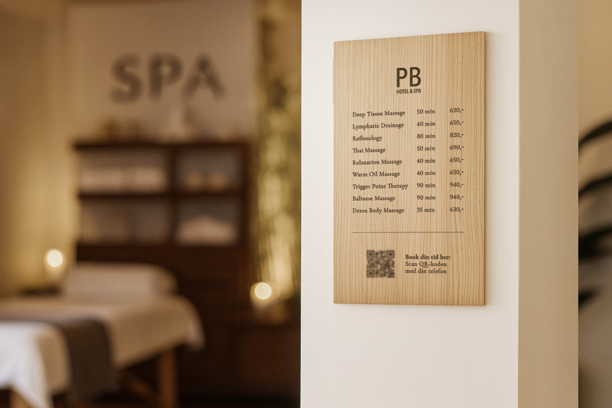 Stort skilt i træ til spa med prisliste eller information og evt. QR-kode – et elegant og roligt udtryk, der passer perfekt til wellness-områder. Skiltet fremstilles i træ med præcis gravering.