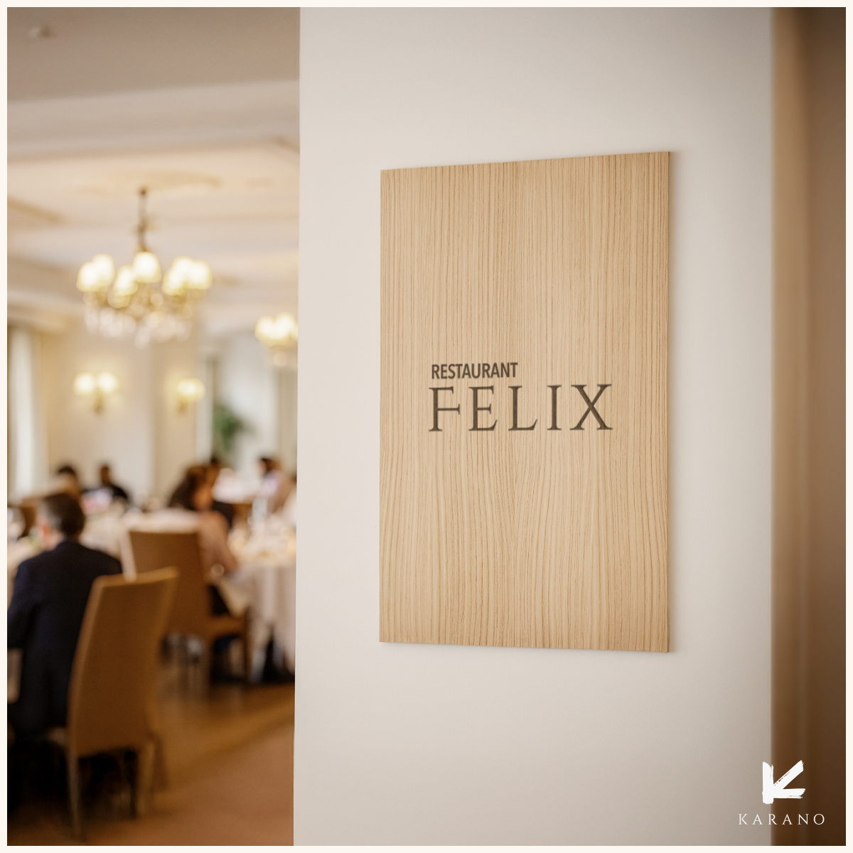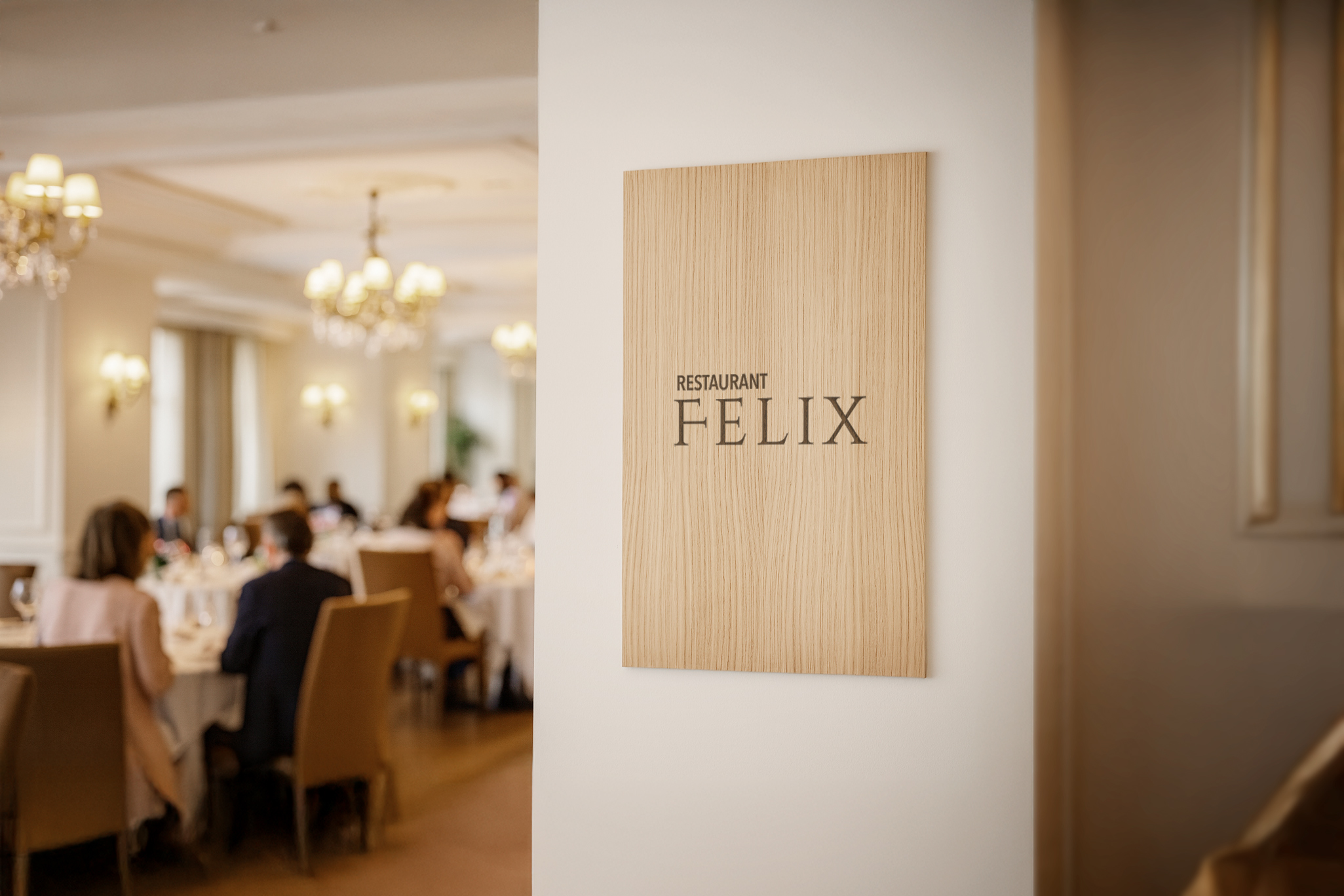 Stort logoskilt i træ, designet til hoteller, restauranter, barer og caféer. Et eksklusivt og holdbart skilt med præcis gravering, der giver et stærkt og stilrent udtryk i receptionen, ved indgangen eller bag baren.