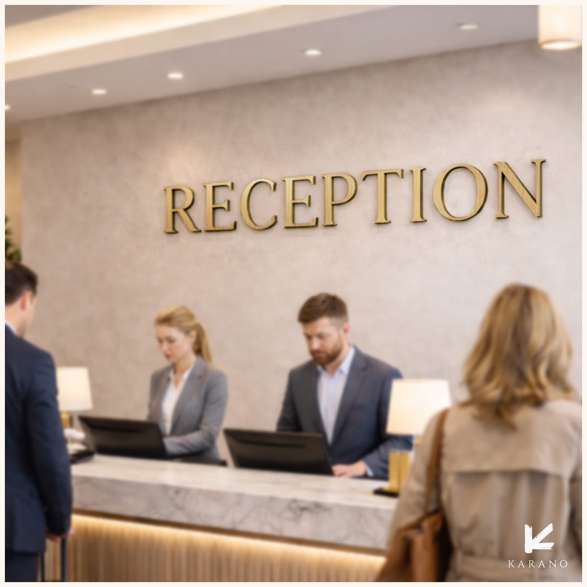 Stort receptionsskilt i guld til hotel med et eksklusivt og professionelt udtryk. Skiltet skaber et elegant førstehåndsindtryk og passer perfekt til receptioner, hvor kvalitet og visuel identitet er i fokus.