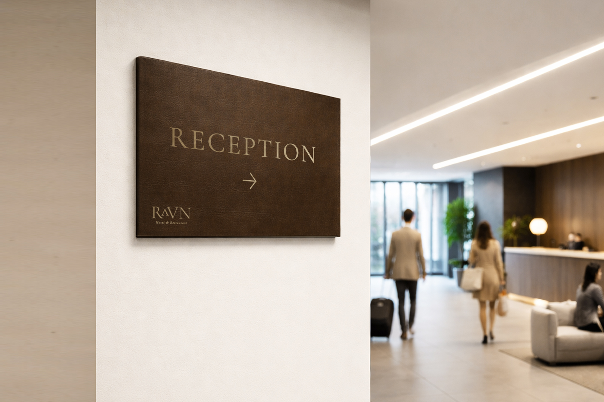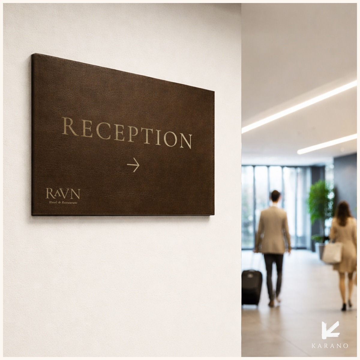 Retningsskilt i læder med elegant guldskrift og solid bagplade. Skiltet giver tydelig vejvisning og et eksklusivt udtryk, der passer perfekt til hoteller og andre stilfulde erhvervsmiljøer.