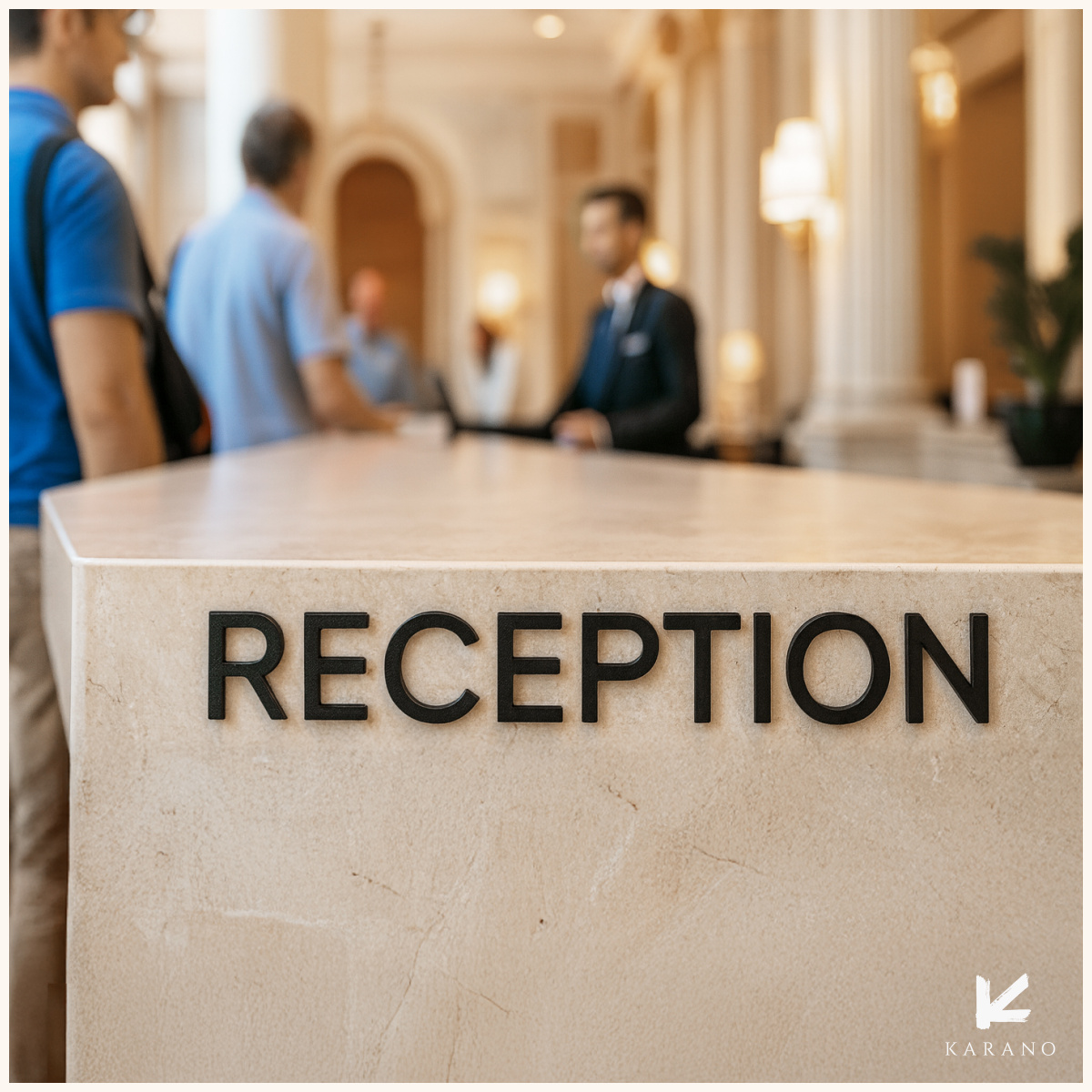 Udskåret bæredygtigt receptionsskilt til hoteller, fremstillet i kvalitetsmaterialer med et stilrent og professionelt udtryk. Skiltet skaber en tydelig og indbydende markering af receptionen.