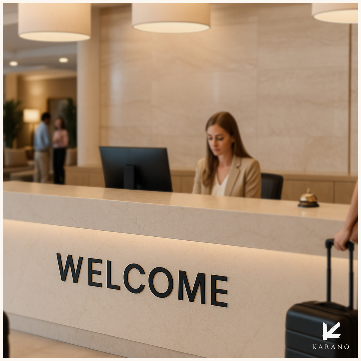 Udskåret Welcome-skilt i bæredygtigt træ til hotelreceptionen. Fremstillet i valgfri træsort med elegant og indbydende udtryk. Perfekt til at byde gæster velkommen med stil – både i reception, lobby og loungeområder.
