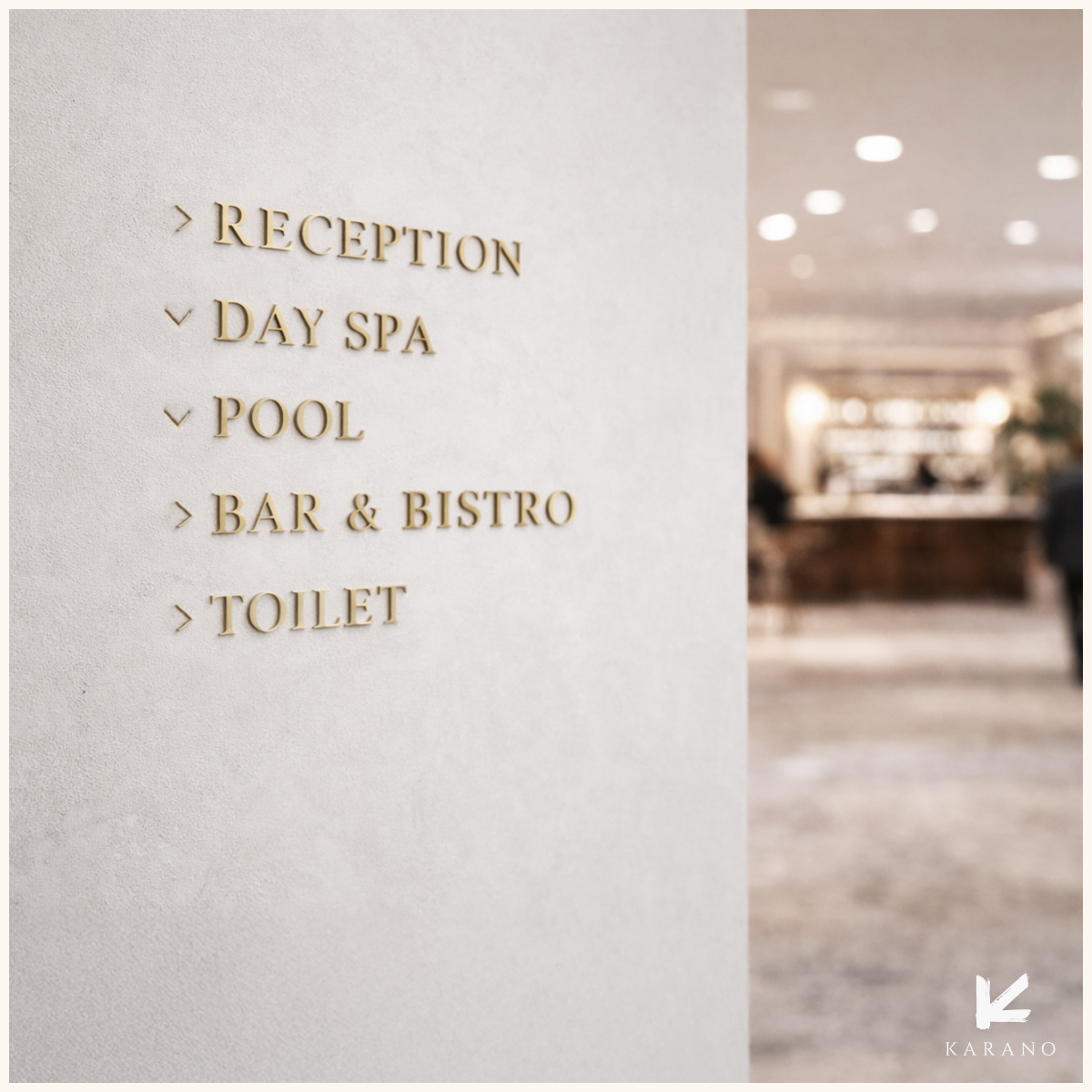 Udskåret tekst i guld til hotel, der skaber et eksklusivt og indbydende udtryk. Elegant skiltning til lobby, gange, værelser og fællesarealer, hvor tydelig anvisning kombineres med et luksuriøst design.