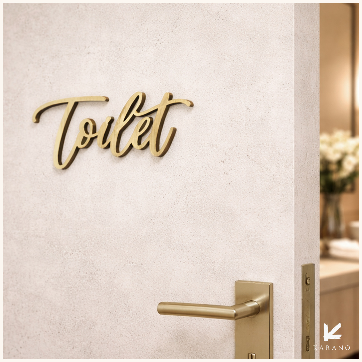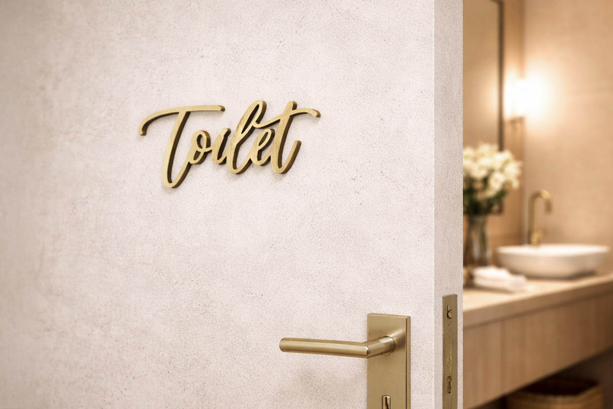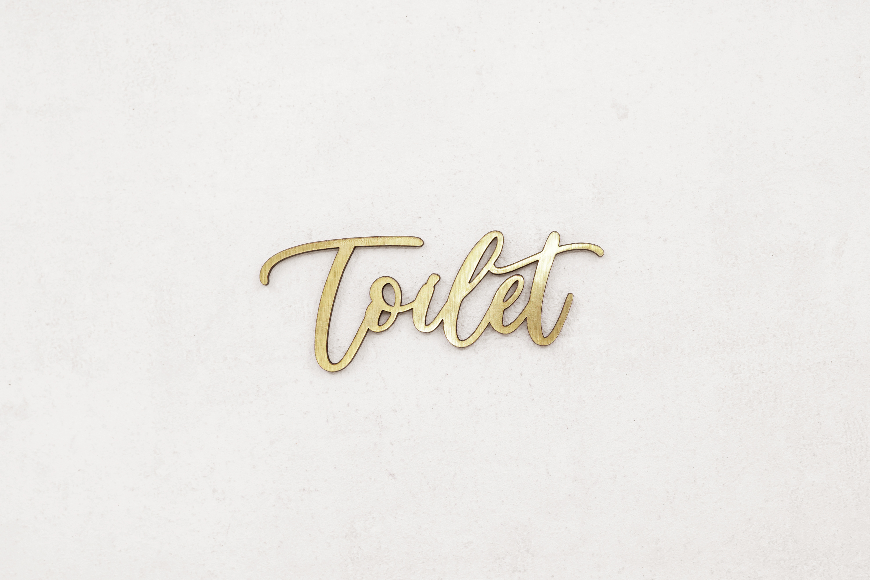 Udskåret toiletskilt i guld med et elegant og eksklusivt udtryk. Skiltet giver tydelig skiltning og passer perfekt til hoteller, restauranter og andre stilfulde erhvervsmiljøer.