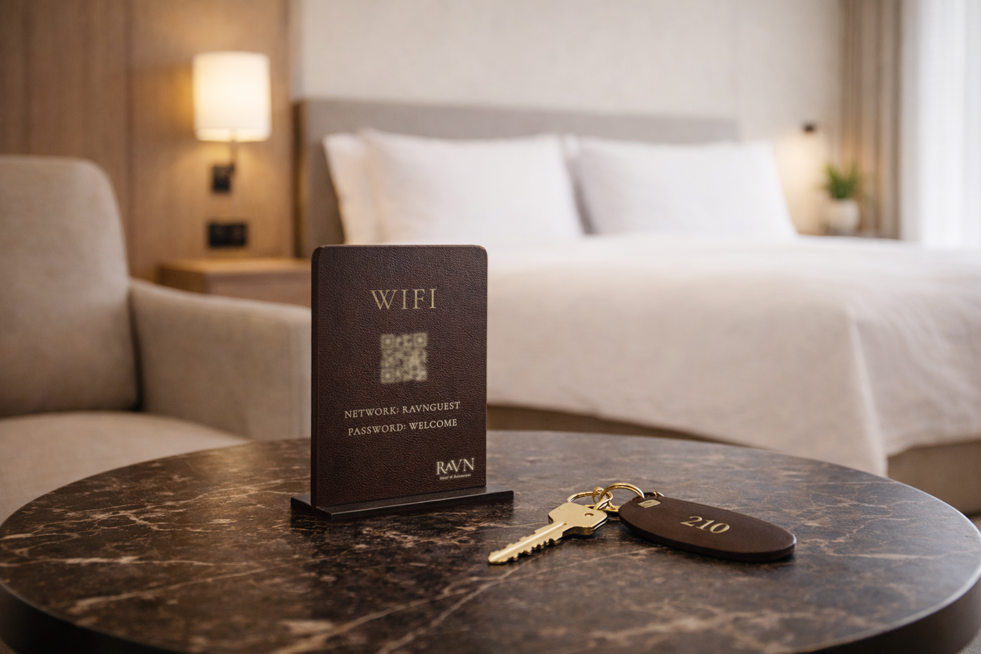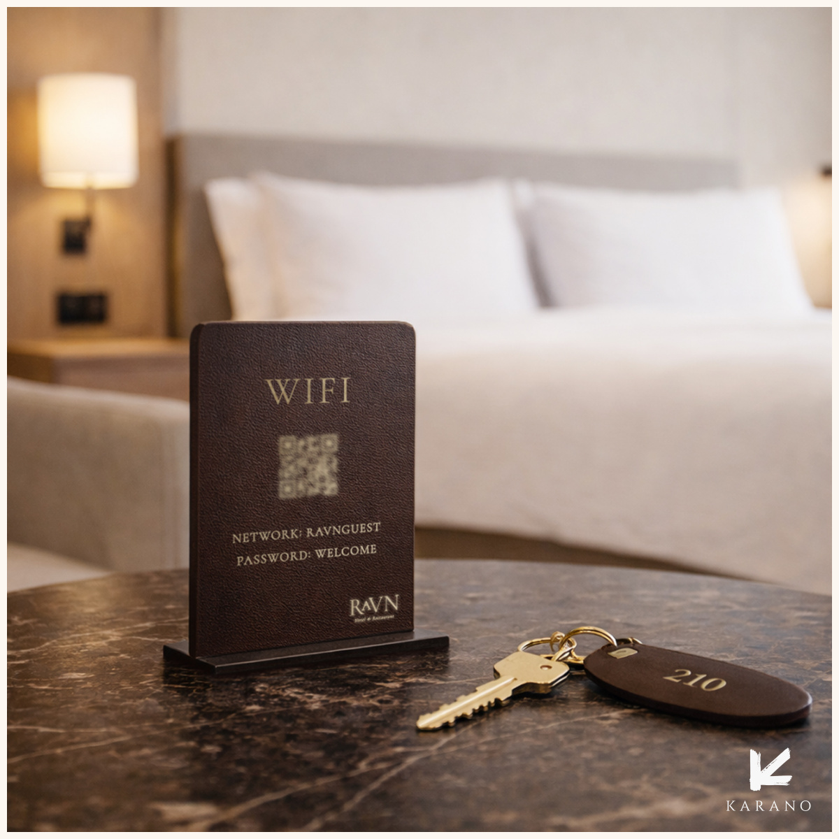 WiFi QR-skilte i læder til hoteller med et stilrent og eksklusivt udtryk. Skiltene giver gæsterne nem og hurtig adgang til hotellets WiFi og passer perfekt ind i både værelser og fællesområder.