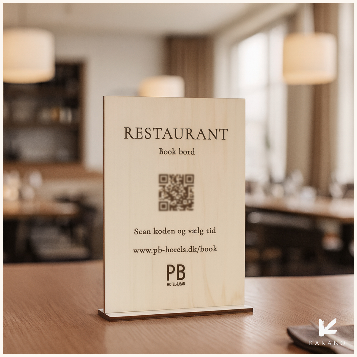 Restaurant booking-skilt med QR-kode i træ. En stilfuld og funktionel løsning, der guider gæsterne til online bordbestilling. Skiltet er graveret i træ og kan tilpasses med egen tekst, logo og træsort.
